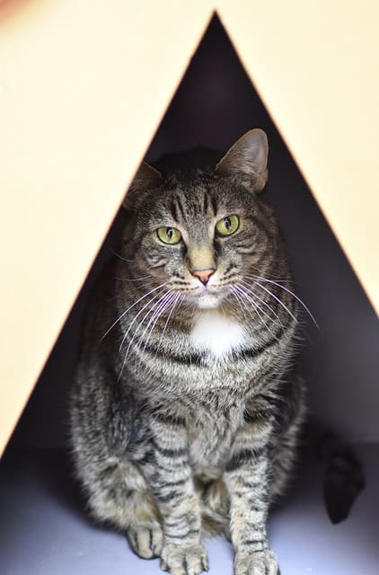 We feel sorry for Louie. This isn’t for his appearance; he’s very handsome, being a large brown tabby male with a bit of white on his chest. But he had lived in one house since he was a kitten (the summer of 2009) and he was suddenly surrendered a few weeks ago. That’s a big change for any cat. Unfortunately, Louie has a history of house soiling and he has had crystals in his urine; the combination was too much for his previous owner, and Louis came to us via our Exceptional Circumstances Program.