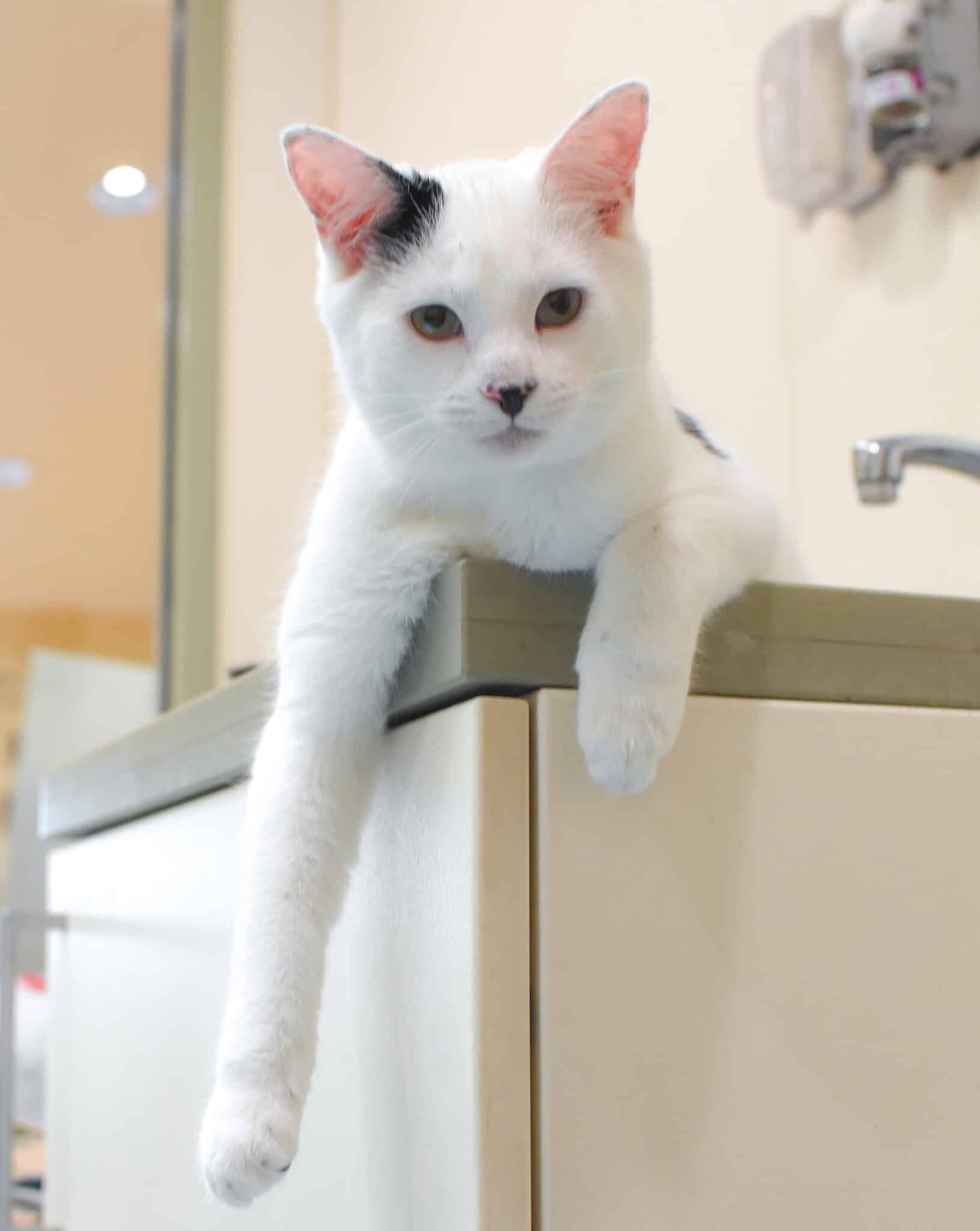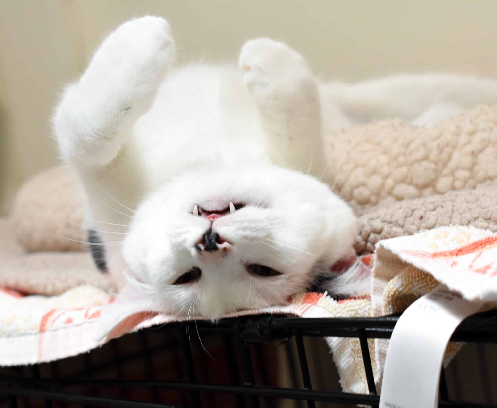 In Elliot’s early weeks with us, we had to express his colon to prevent constipation, but now he is able to go on his own—he just doesn’t always make it to the litter box. Elliot will position himself, but often gives up before producing anything while moving on to other activities, leaving physical evidence where it may fall. Elliot has visited an internal medicine specialist who encouraged us to move forward with our current protocol of diet and stool softeners to allow proper defecation. Elliot also has a pronounced overbite that we will monitor as he grows into adulthood. For now, it simply adds to his charm.