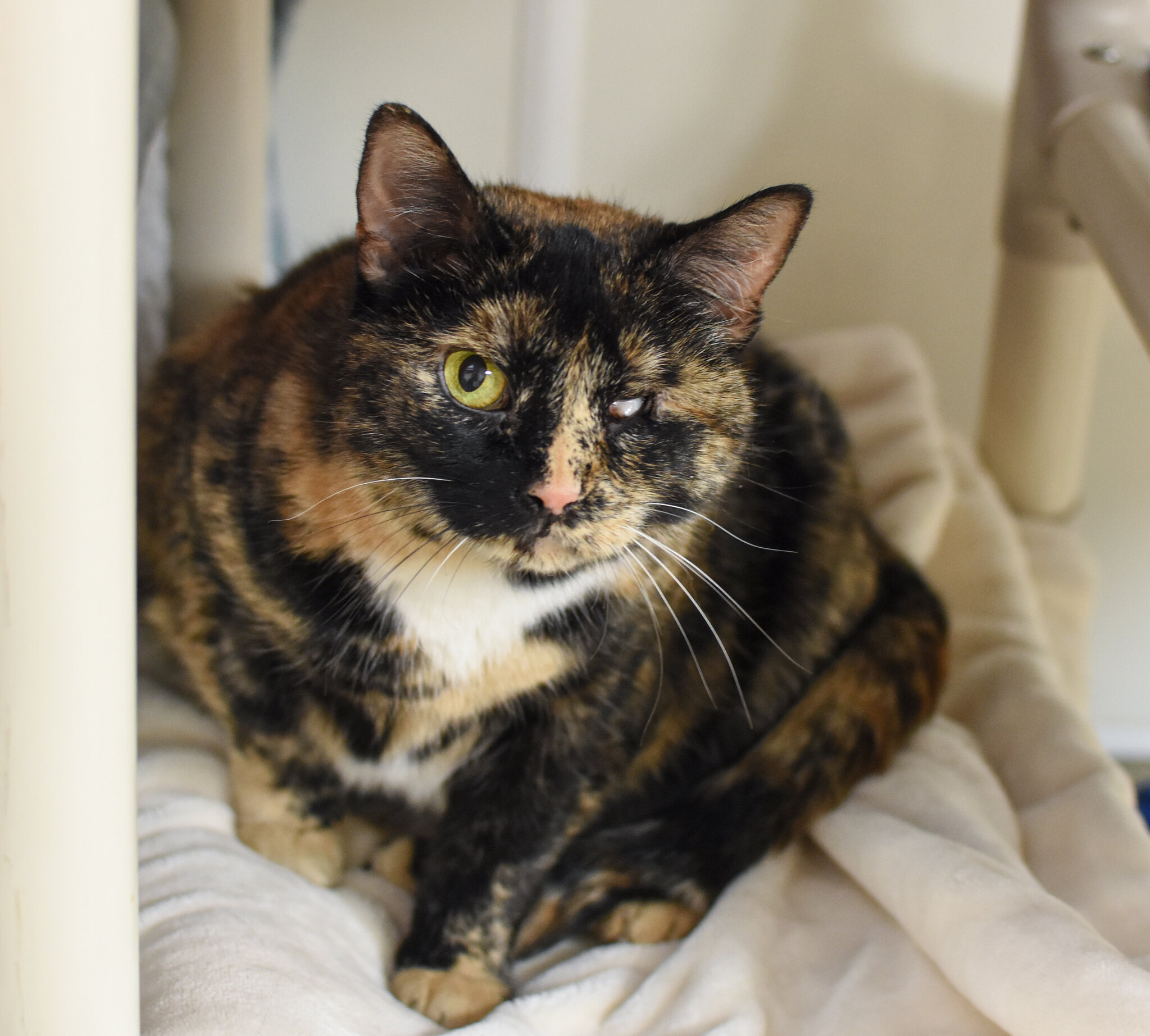Cammy needs a home that understands and respects her boundaries. She is currently not the hugest fan of being handled but is very food motivated. Shake a bag of treats and Cammy will come running to get some! We are hoping that we will be able to win over her heart with a good bunch of treats as she is beginning to settle into her suite.