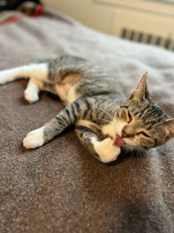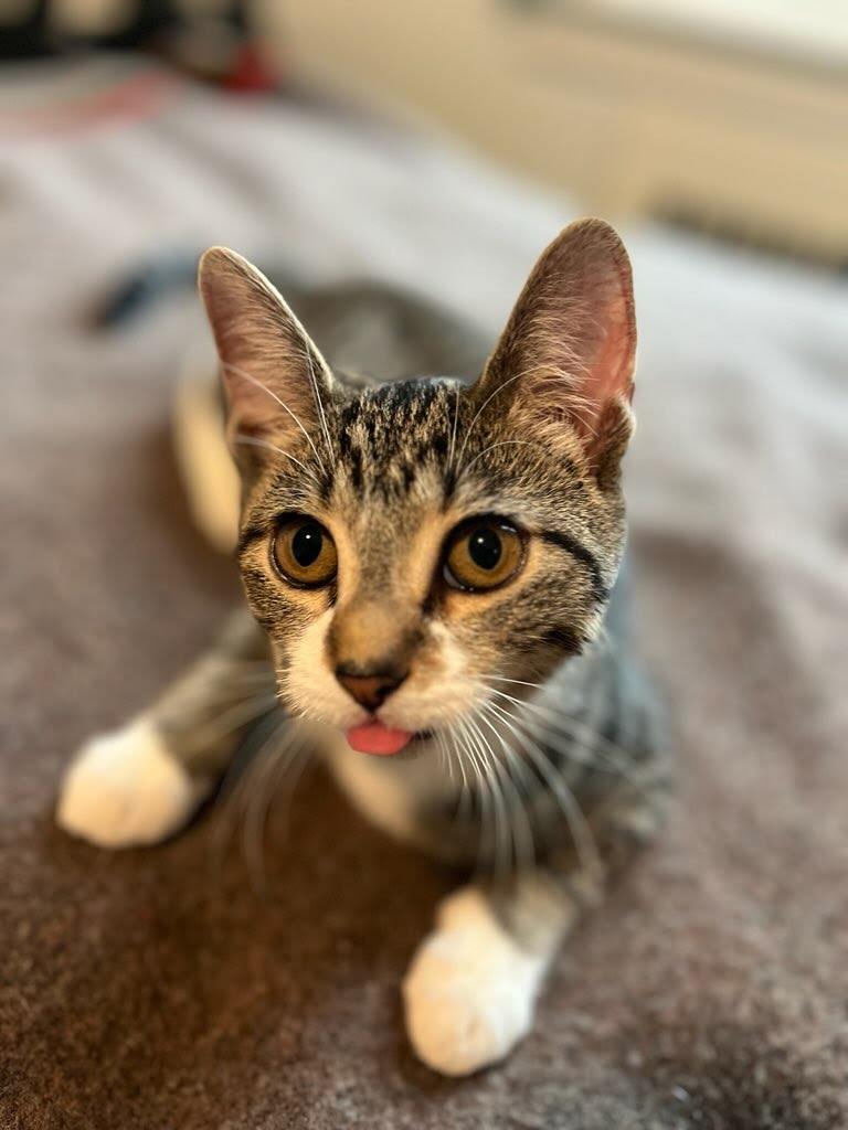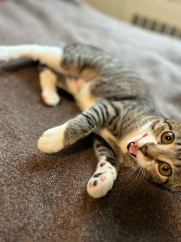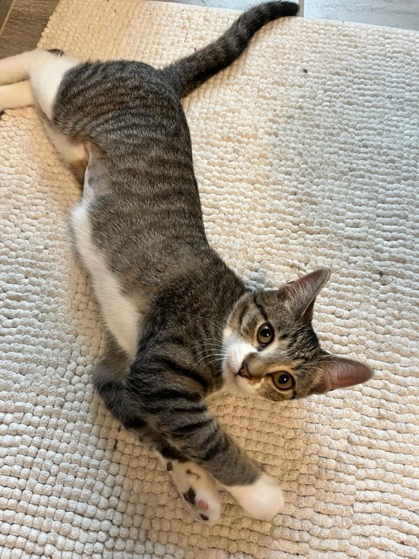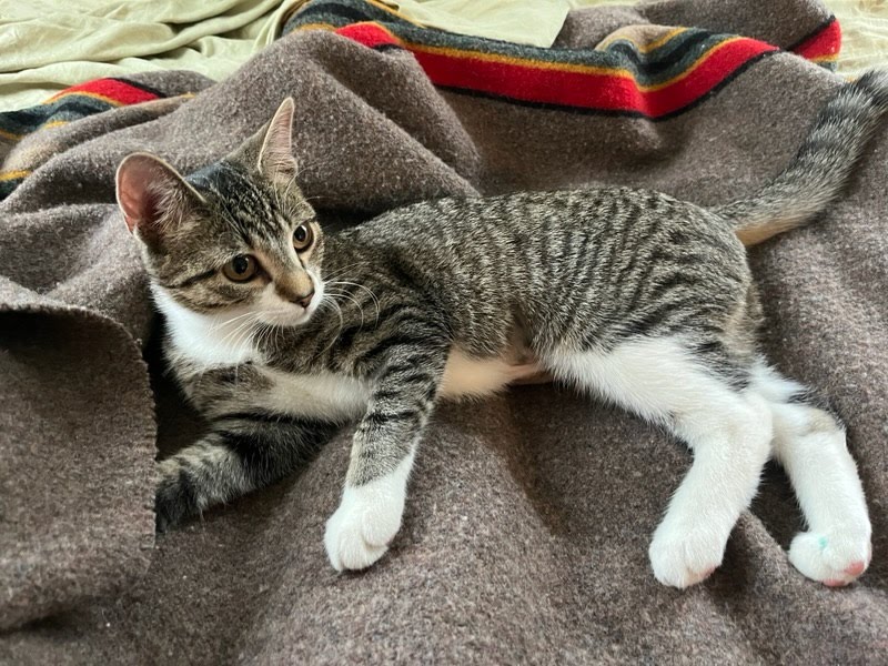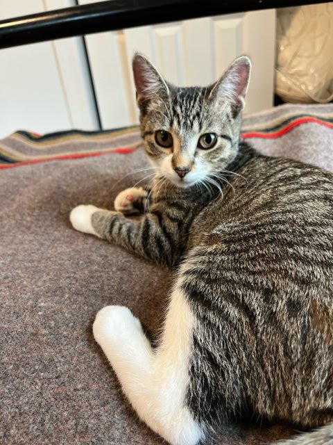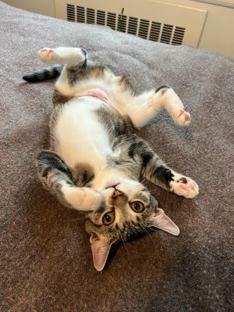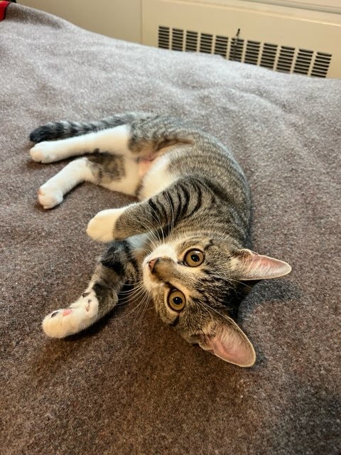 Our little ones have been fully vetted. As you’d expect, they love to play, and they race around like maniacs until they suddenly fall asleep. Nap time lasts just a short while, then play resumes. While adopting more than one kitten isn’t mandatory, it’s awfully nice for these young’uns to have someone their age to play with.