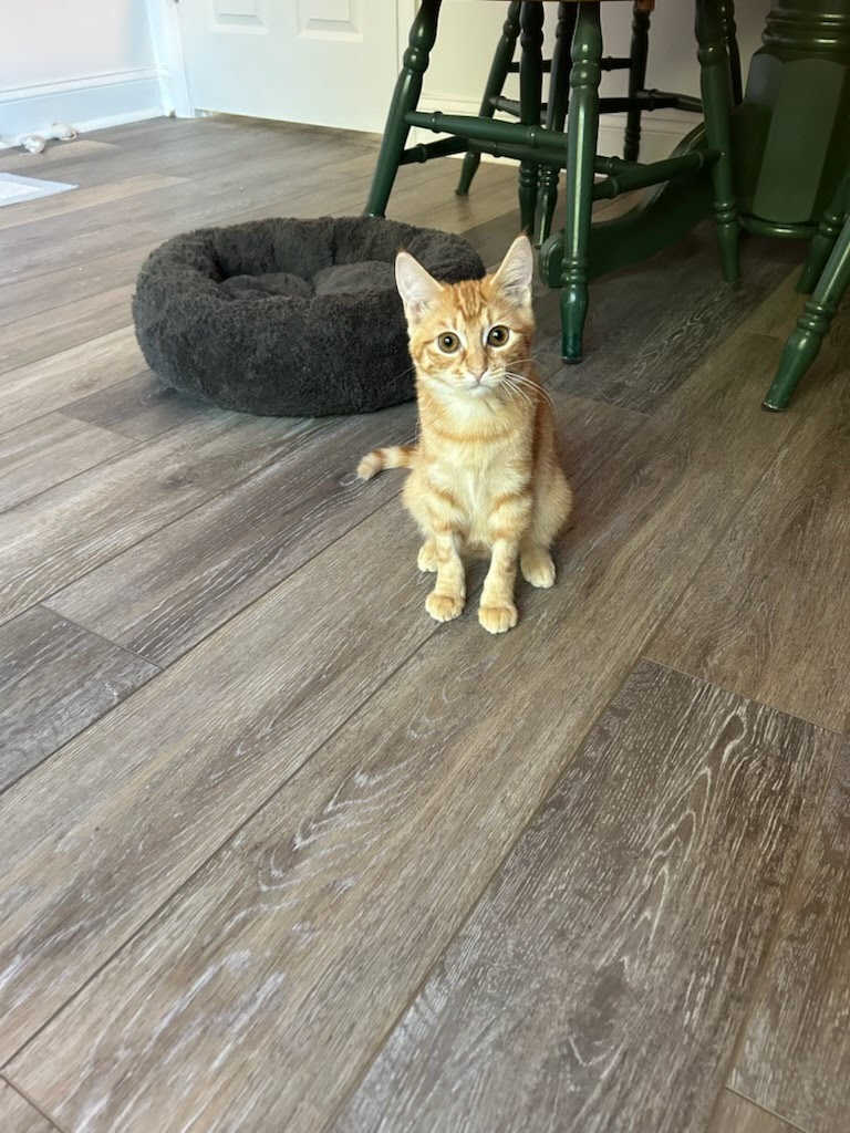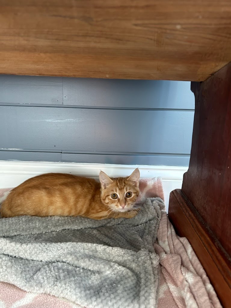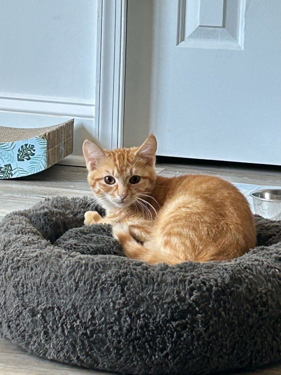 Our little ones have been fully vetted. As you’d expect, they love to play, and they race around like maniacs until they suddenly fall asleep. Nap time lasts just a short while, then play resumes. While adopting more than one kitten isn’t mandatory, it’s awfully nice for these young’uns to have someone their age to play with. Marigold is bonded to her brother, Lotus, and they would love to be adopted together.