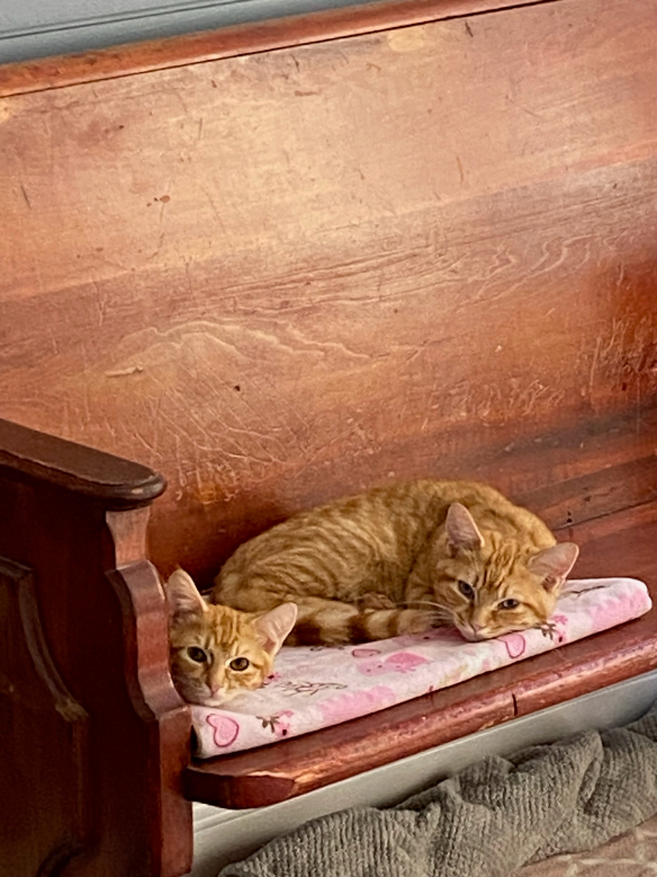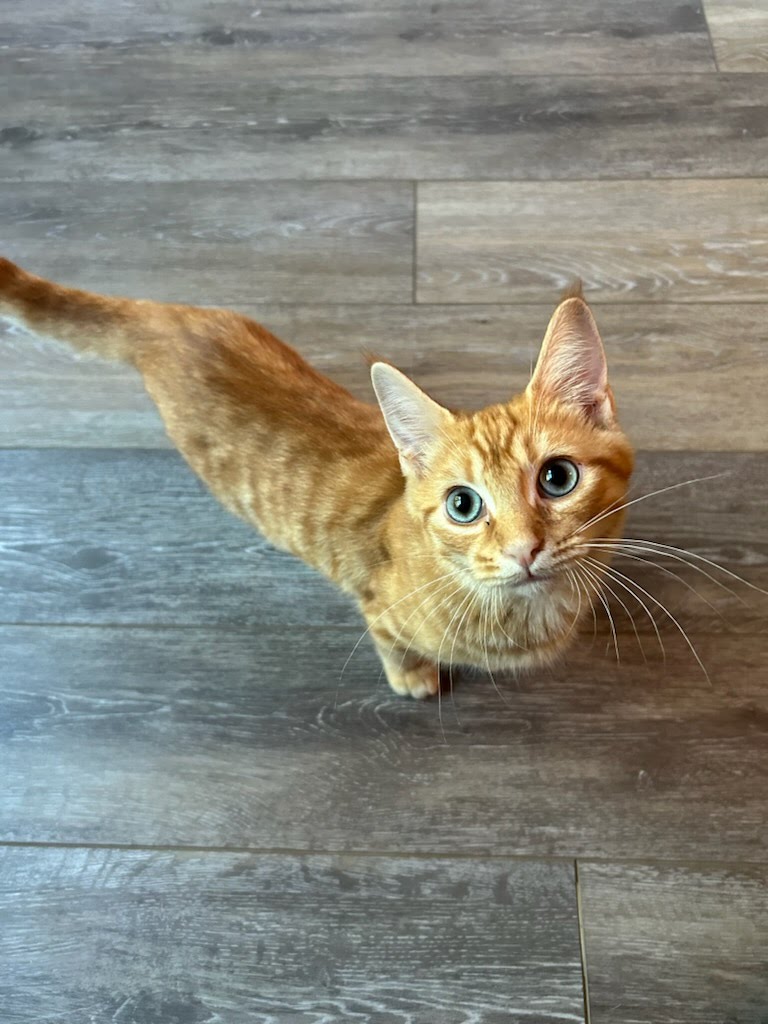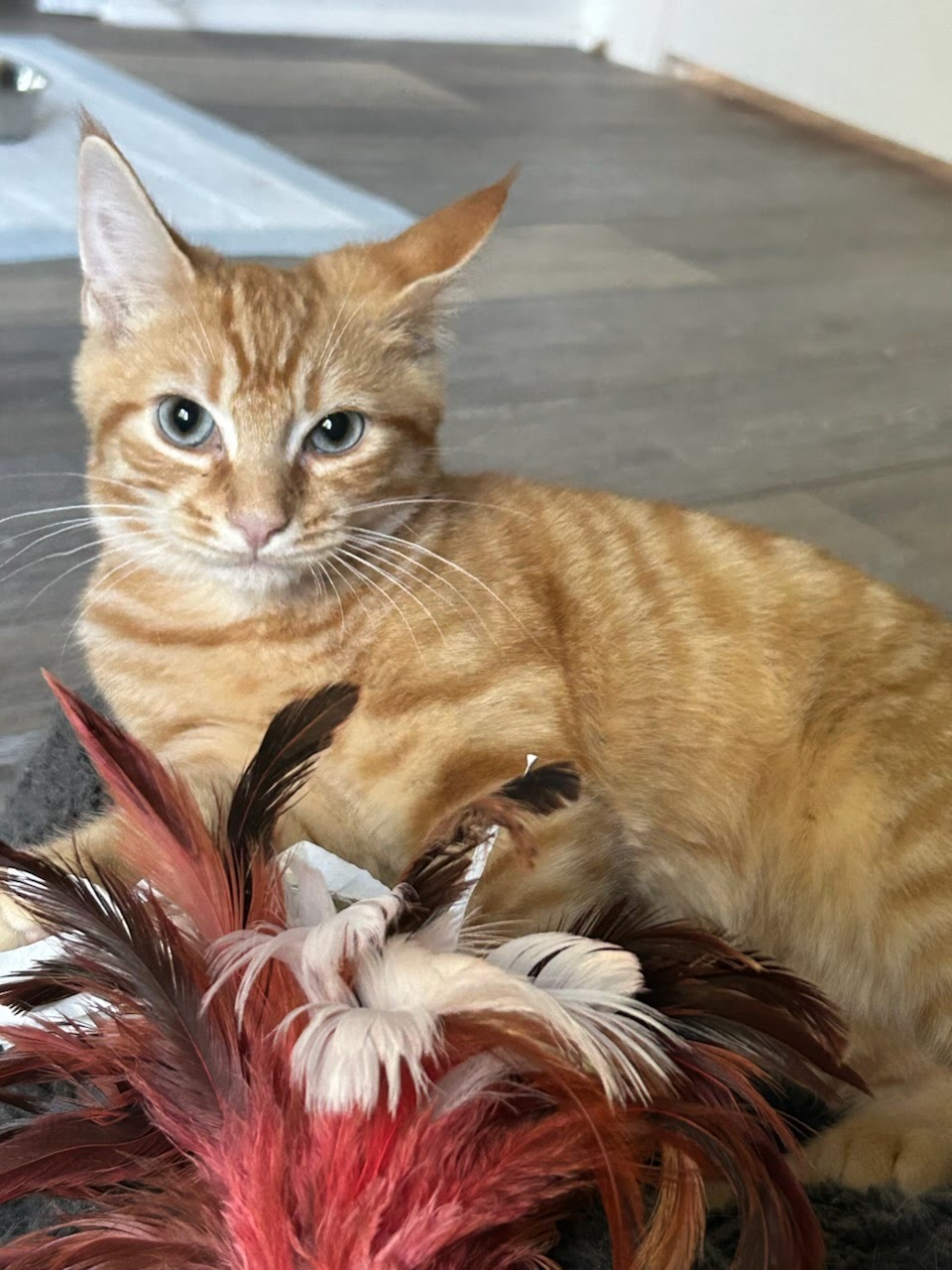 Our little ones have been fully vetted. As you’d expect, they love to play, and they race around like maniacs until they suddenly fall asleep. Nap time lasts just a short while, then play resumes. While adopting more than one kitten isn’t mandatory, it’s awfully nice for these young’uns to have someone their age to play with. Lotus is bonded to his sister, Marigold, and they would love to be adopted together.