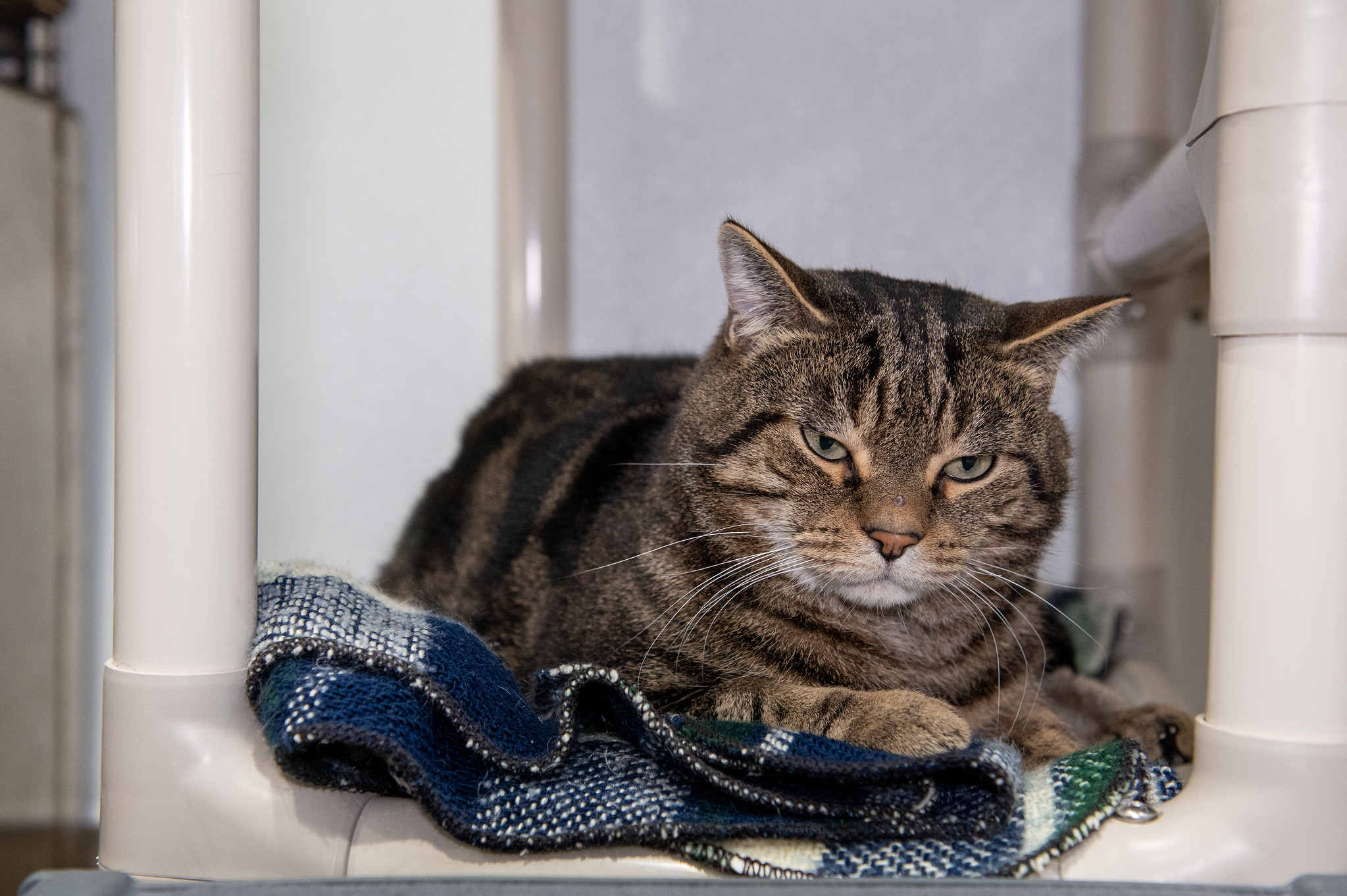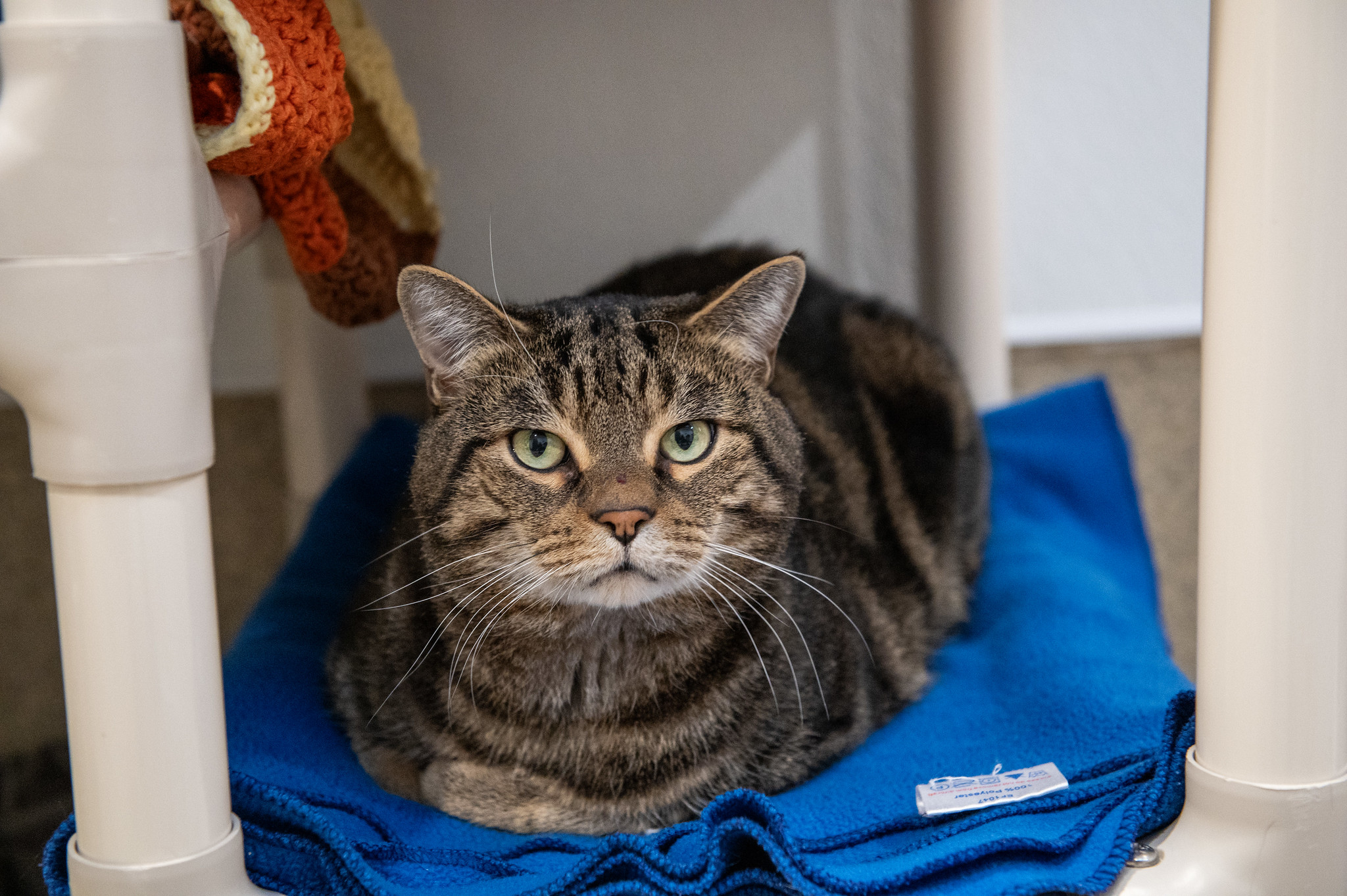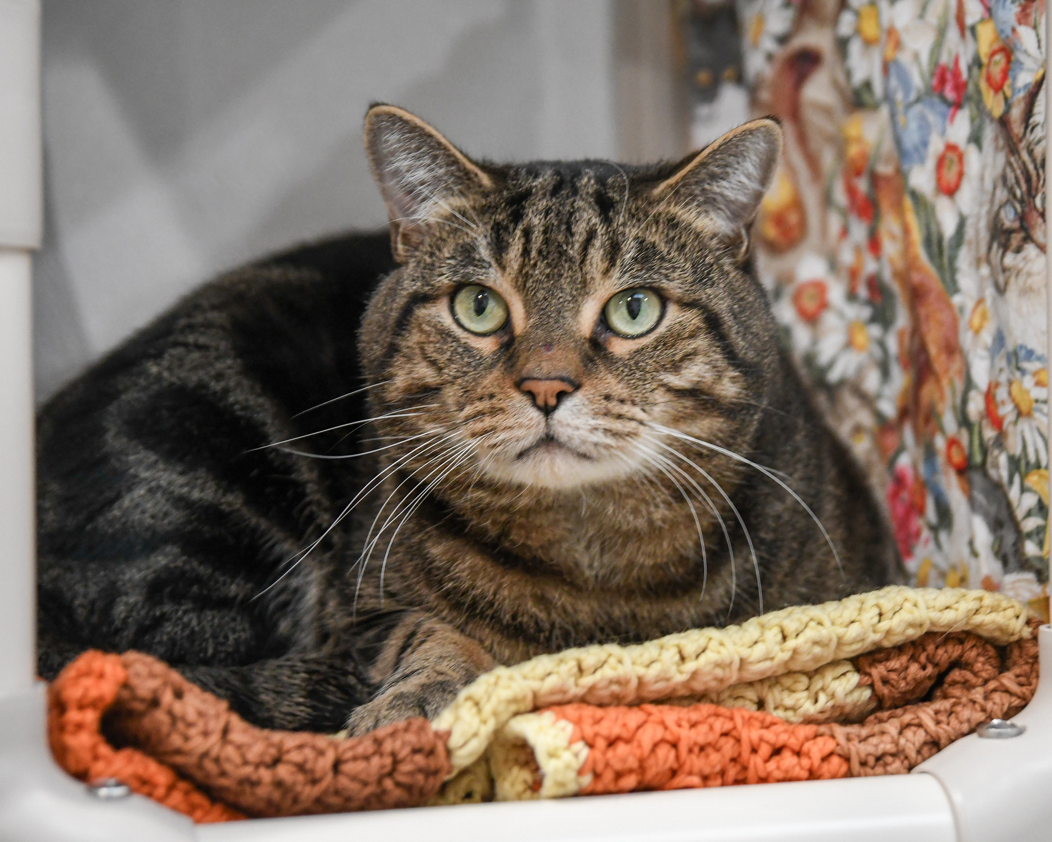 He’s a handsome brown tabby who arrived with his housemate Sandy when their owner could unfortunately no longer care for them. Frank’s life had turned upside down, and this sturdy but softhearted tomcat has responded the only way he knows how: by curling up in a nest of blankets and hiding. In this new environment (loving, but nonetheless scary), Frank isn’t quite sure how to be frank about his feelings. But with patience and kindness, he will come out of his shell and show unguarded affection once he trusts you. Stroke Frank’s nose and trace a path up to the top of his head, and you’ll be rewarded with thunderous purrs.