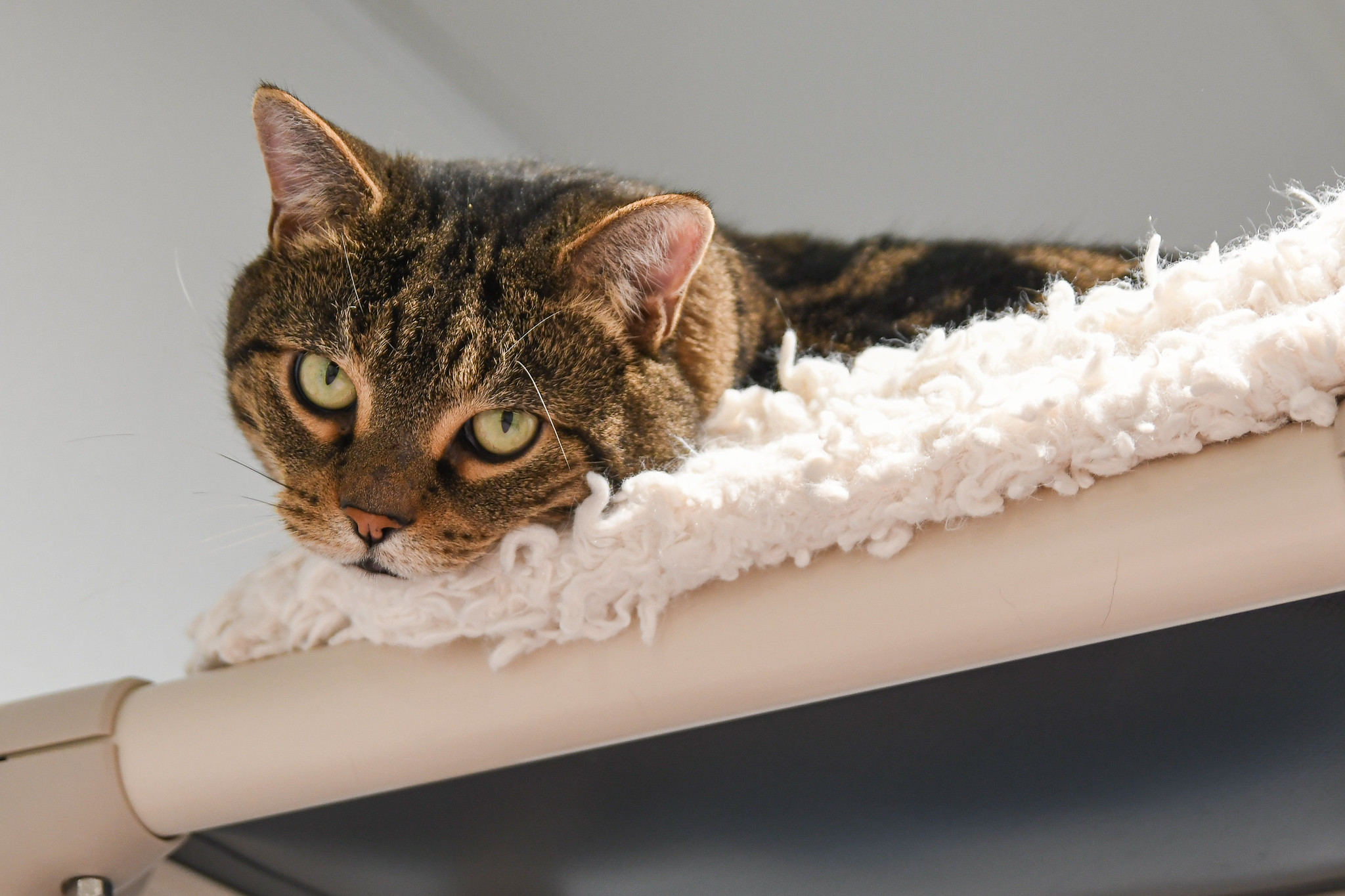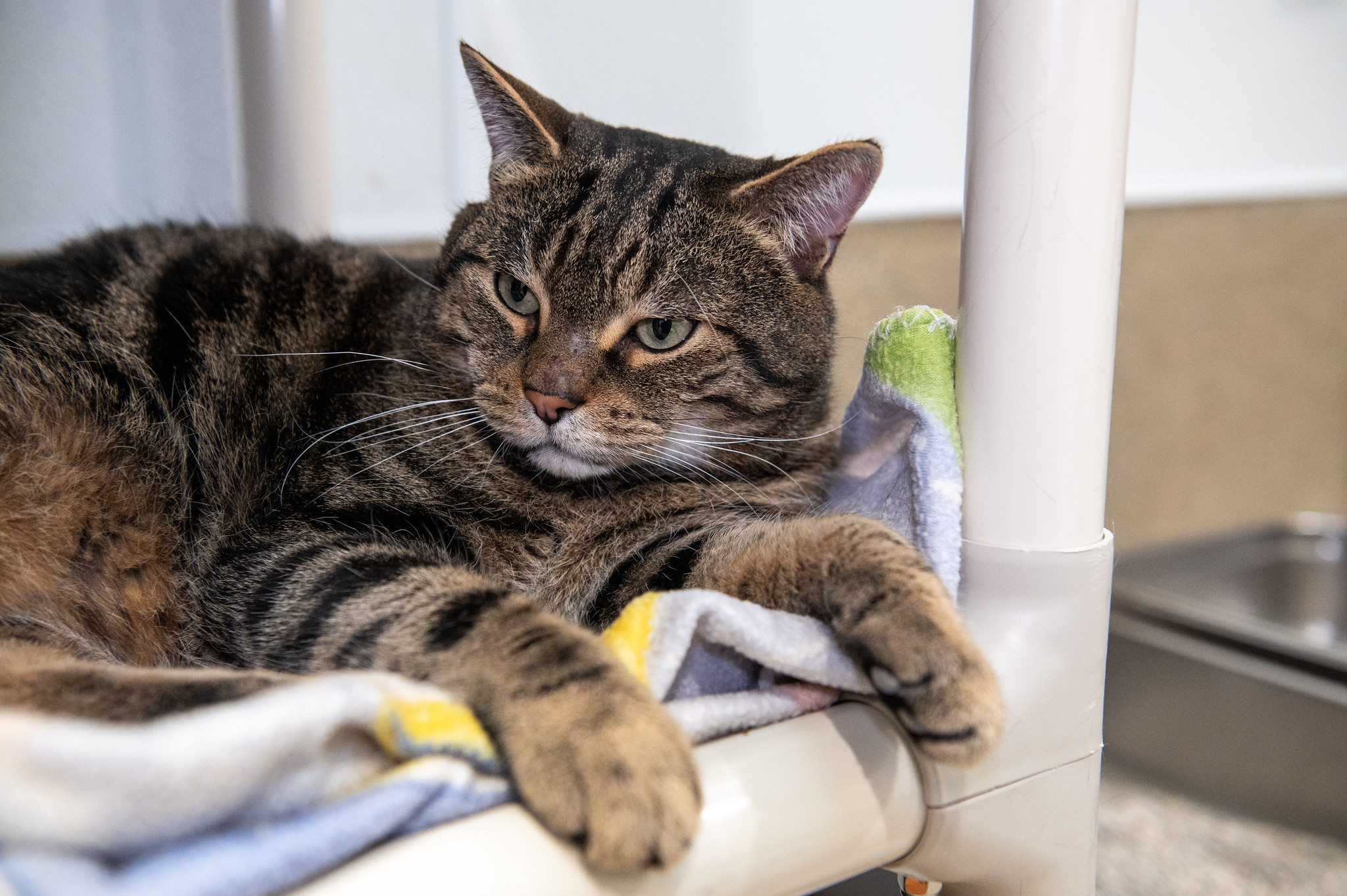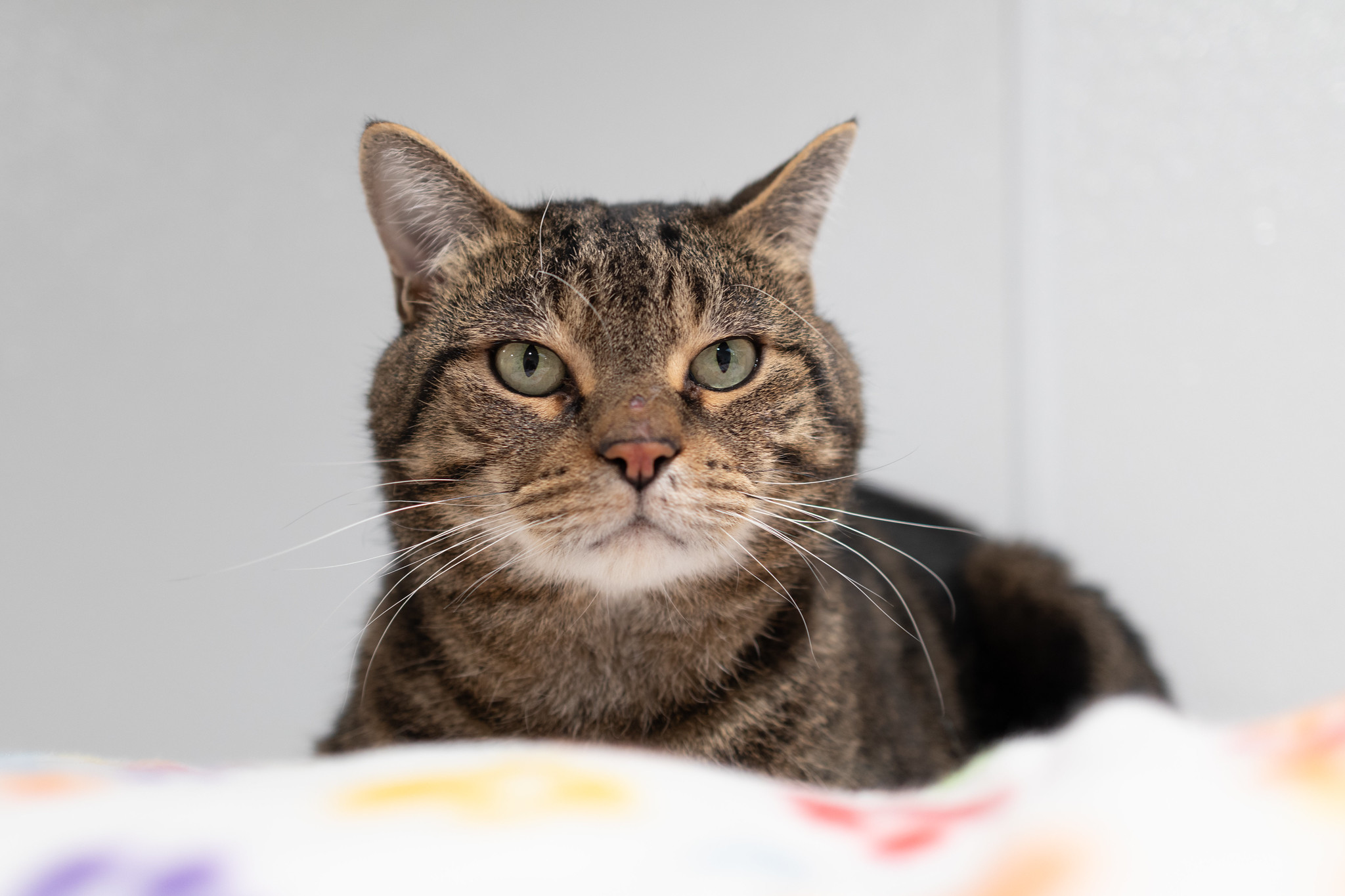 He’s a handsome brown tabby who arrived with his housemate Sandy when their owner could unfortunately no longer care for them. Frank’s life had turned upside down, and this sturdy but softhearted tomcat has responded the only way he knows how: by curling up in a nest of blankets and hiding. In this new environment (loving, but nonetheless scary), Frank isn’t quite sure how to be frank about his feelings. But with patience and kindness, he will come out of his shell and show unguarded affection once he trusts you. Stroke Frank’s nose and trace a path up to the top of his head, and you’ll be rewarded with thunderous purrs.