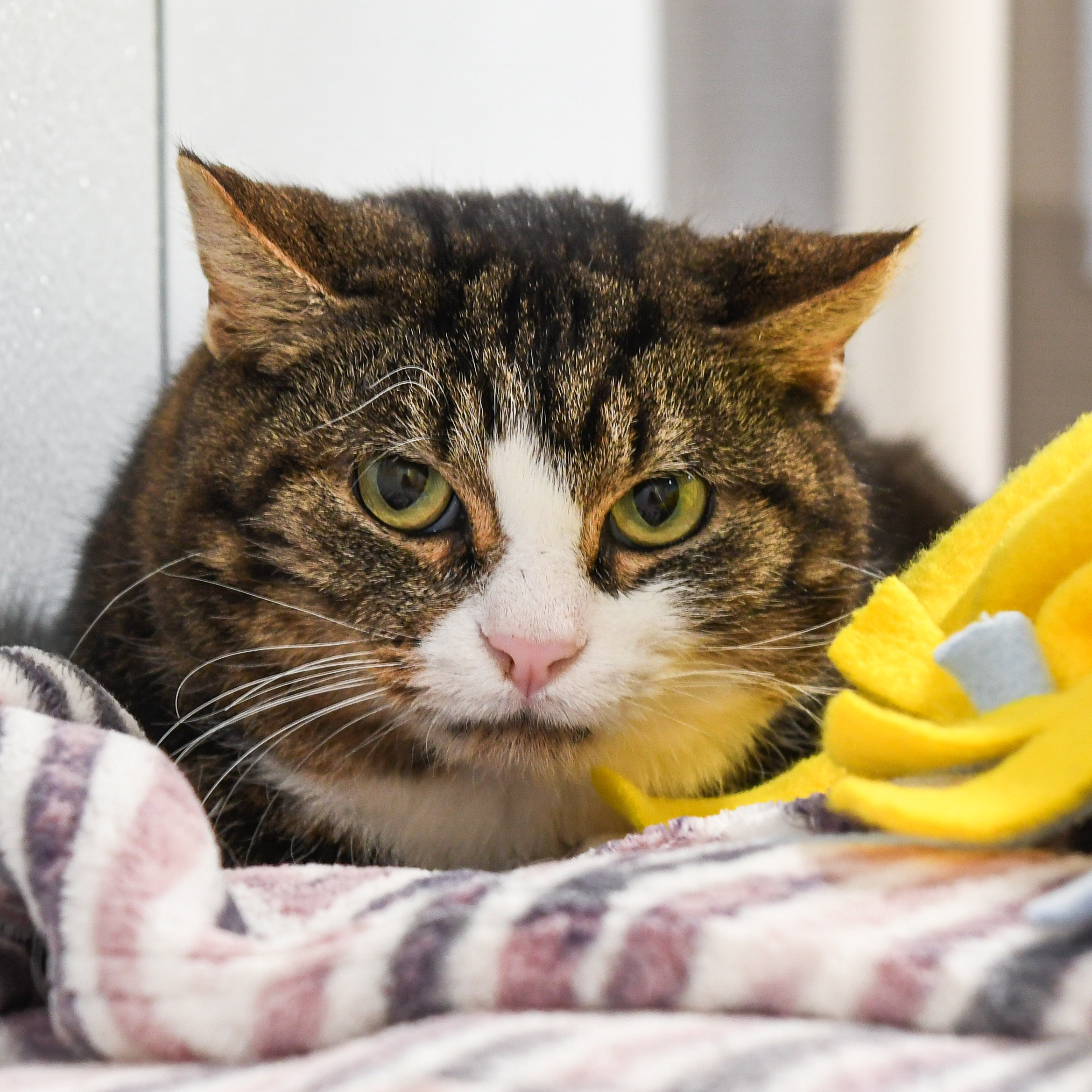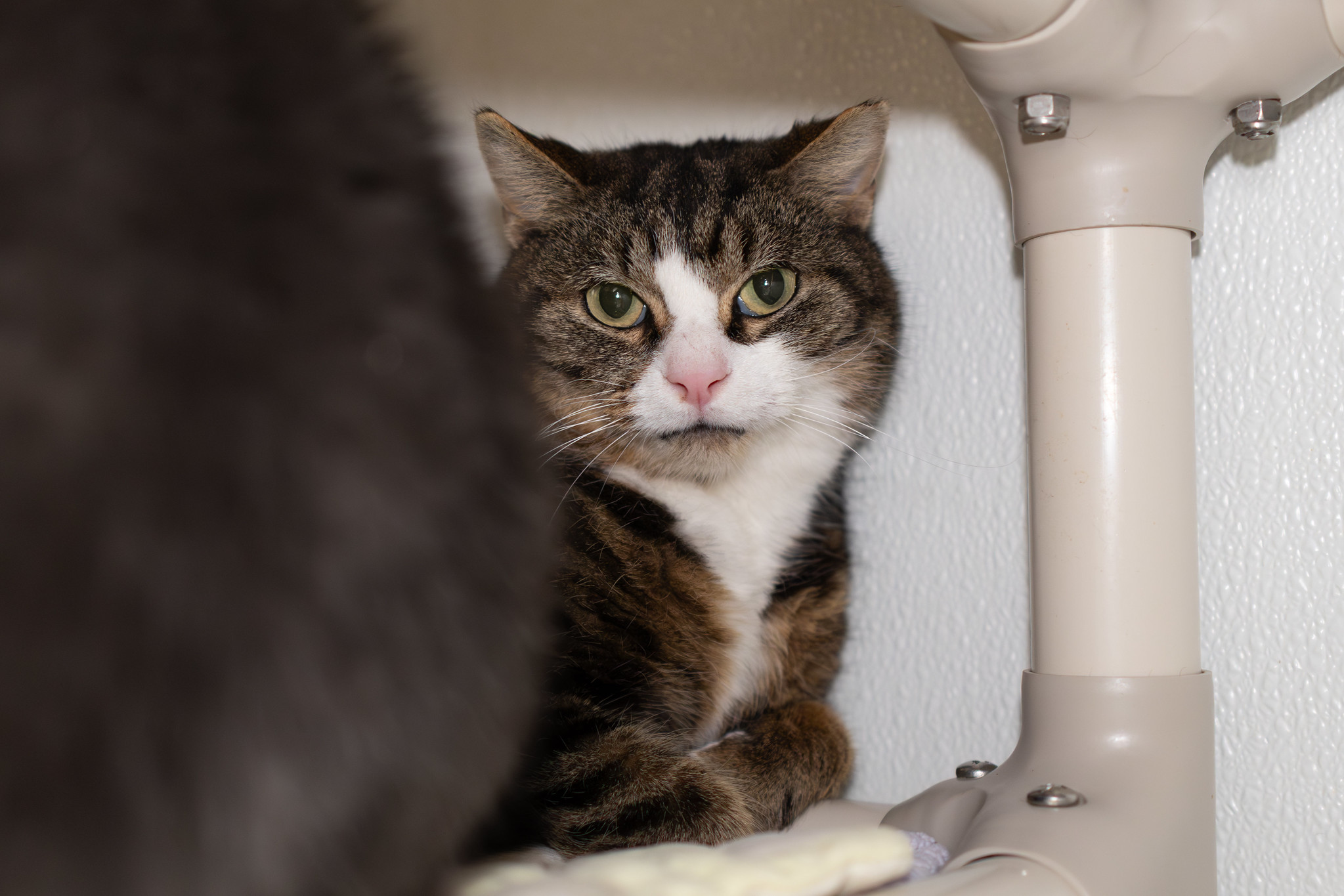 In contrast with his attitude towards people, Marble Rye takes comfort in the company of other felines and can often be found hiding amongst them. He would do best in a calm environment with other cats to keep him company and a human caretaker willing to give him the space she needs.