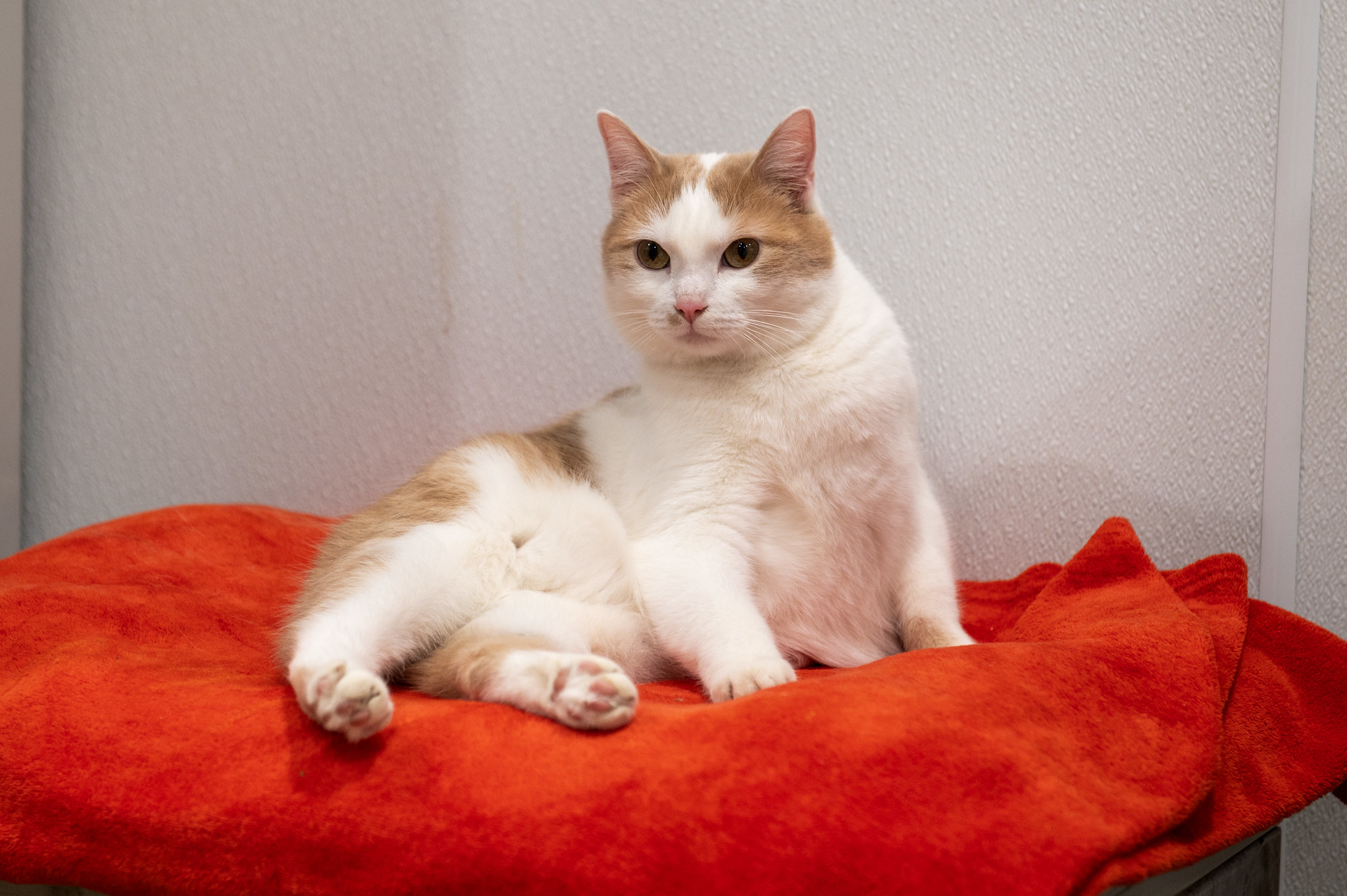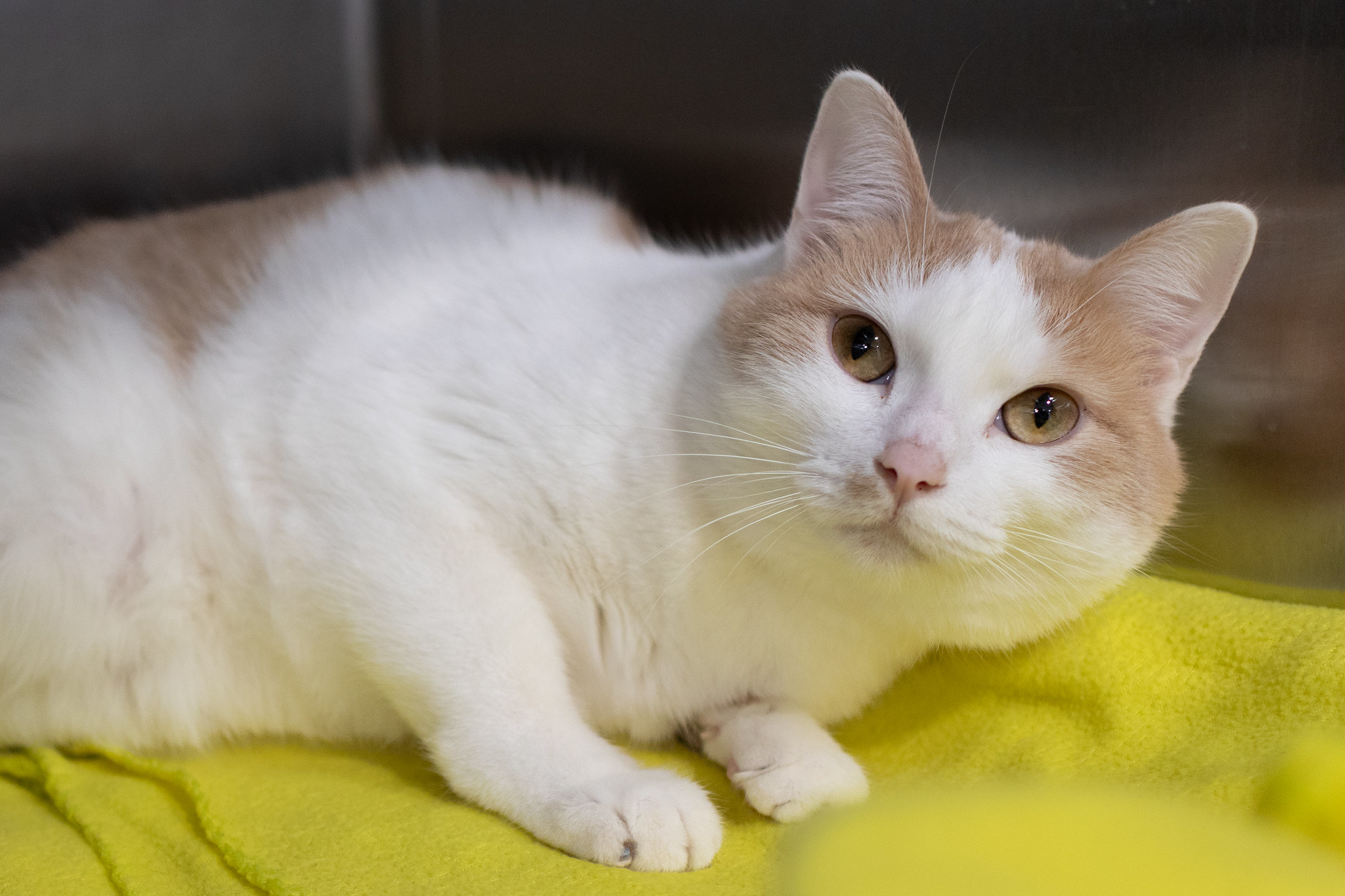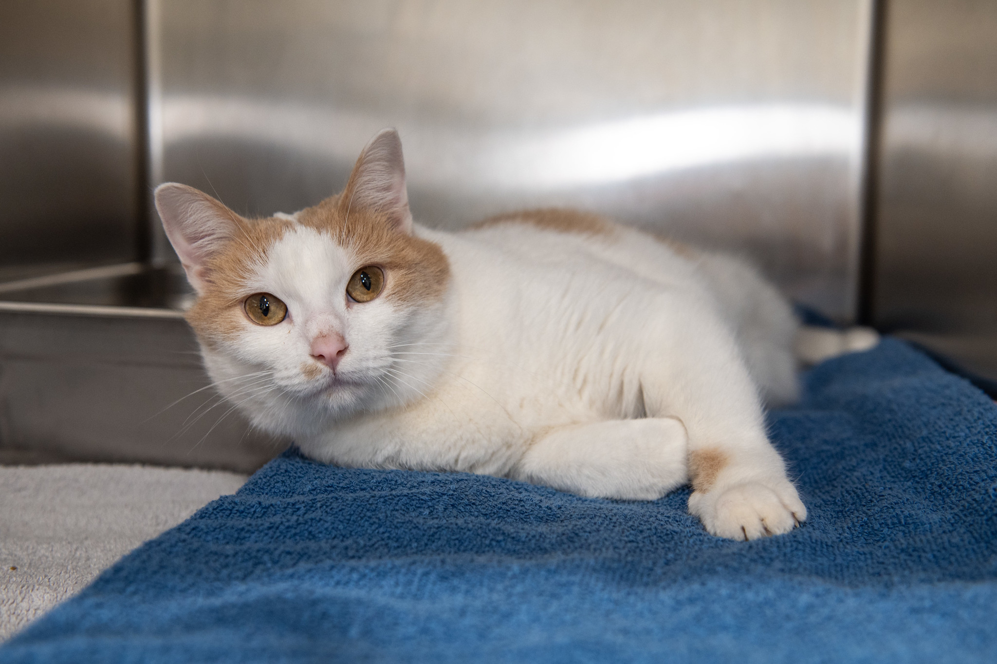 This adorable kitty can be a bit shy at first, but he quickly blossoms into a purring machine. He appreciates being given a moment to sniff your hand, then sweetly presses his head into your palm as the go-ahead for affection. Hannah loves head and chin scratches. They often prompt him to flop onto his side and toss his head back in total contentment.