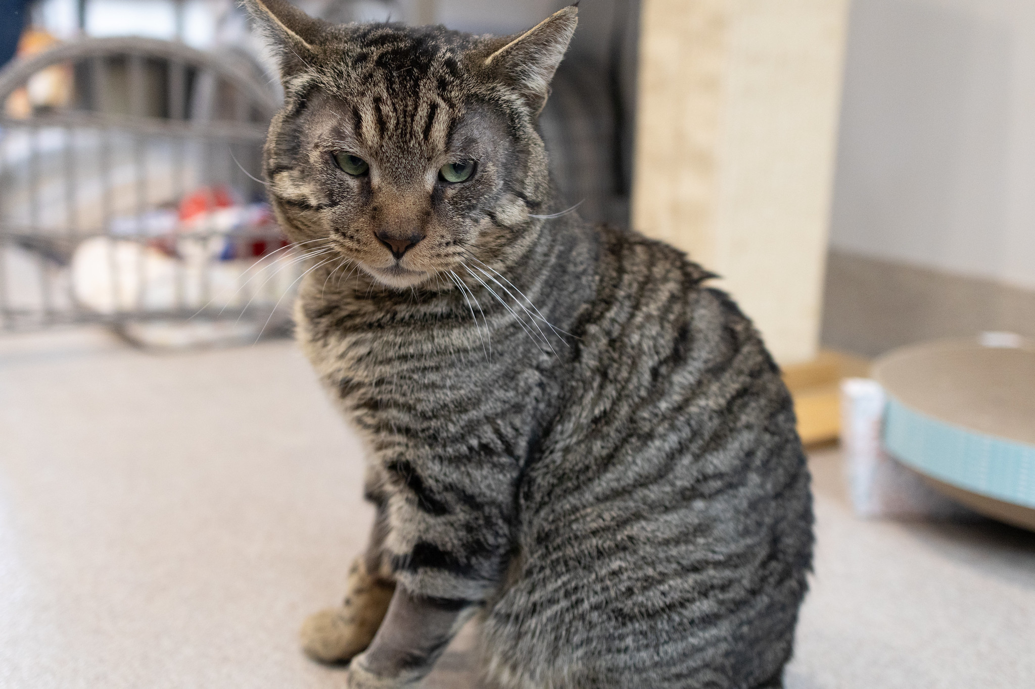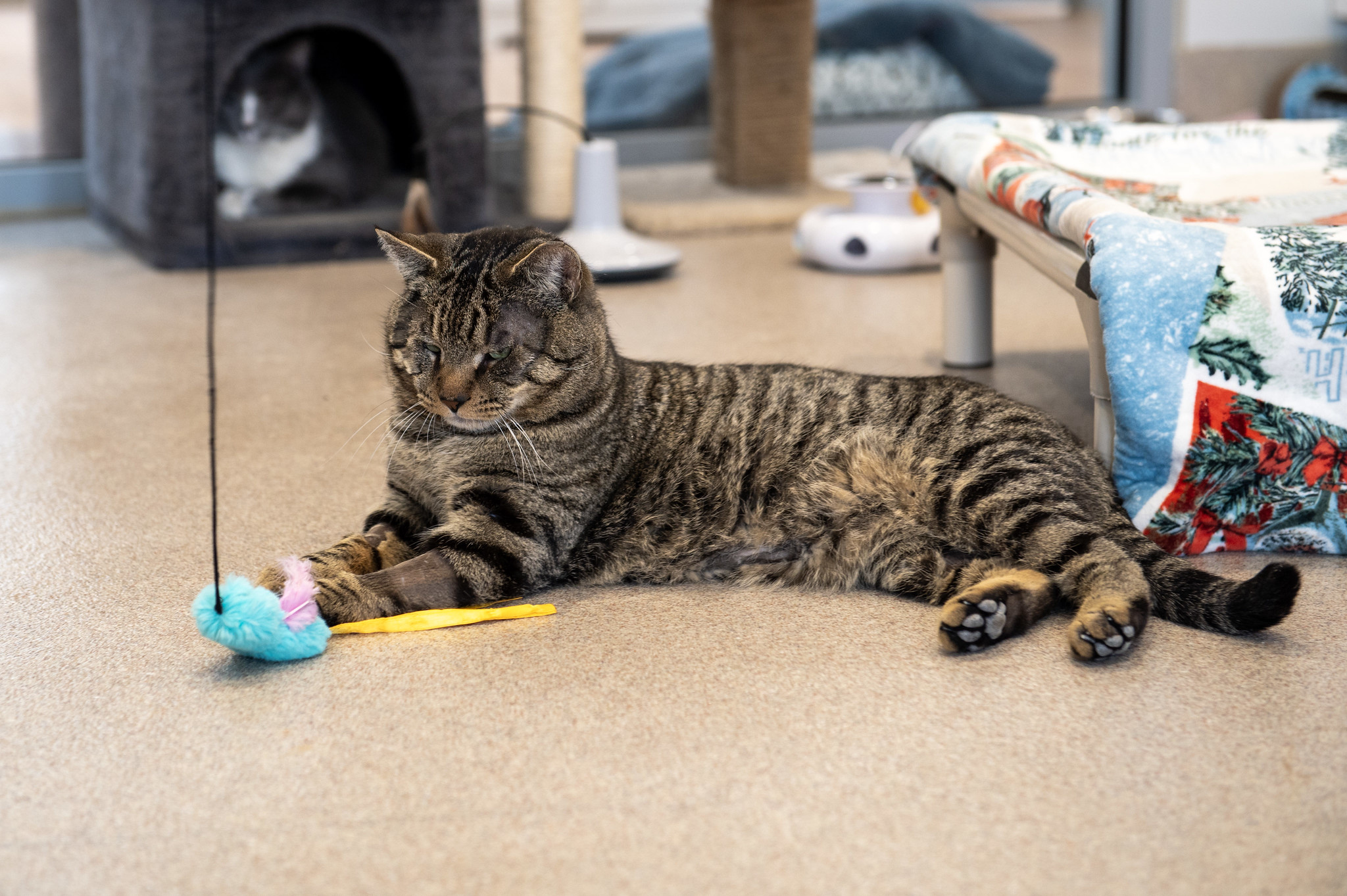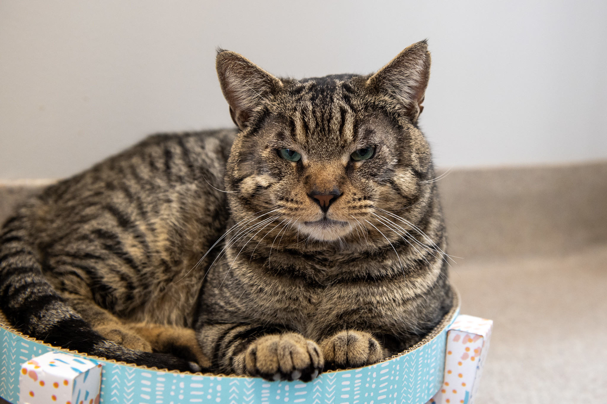 There is something so distinctive about Jamison. You can tell even just by looking at him. His eyes sit on his face in a way that’s somehow more proportionately human than cat and gives him the appearance of a fine, distinguished gentleman who looks as if he’d like to tip his hat to you. Since he has no hat to tip he will do the next best thing when you enter his suite and that is to immediately come greet you with a welcoming meow and flop before you. Jamison is a cat of the people and for the people. This friendly, affectionate tabby wants to meet you, be near you, and to give and get all of the cuddles with you. He is so easygoing that he even loves to be held like a baby, which is such a treat (for both human and kitty alike)! He is a sweet boy who is just waiting for his forever lap, but will patiently take any lap on offer in the meantime. There is room in that big open heart for all of us.