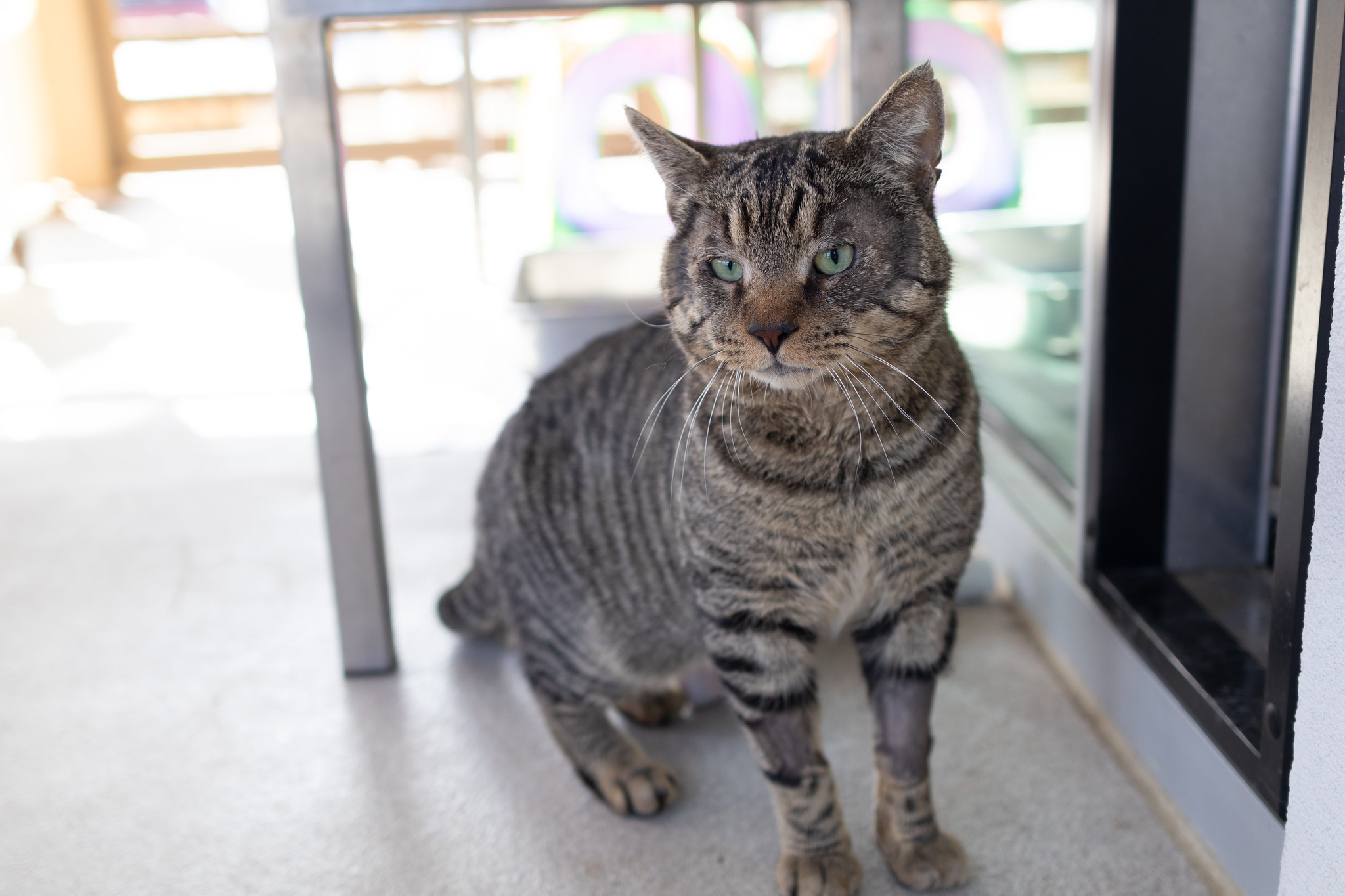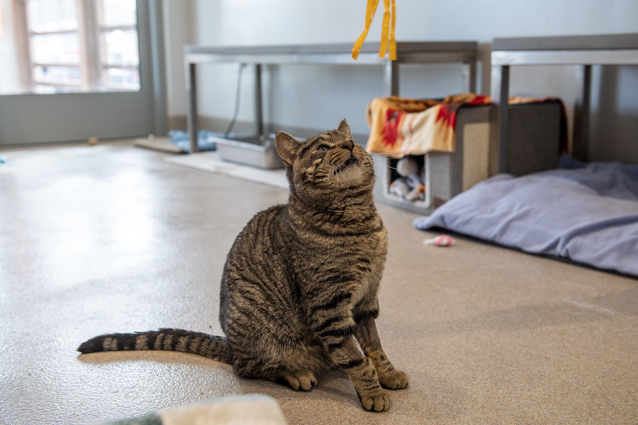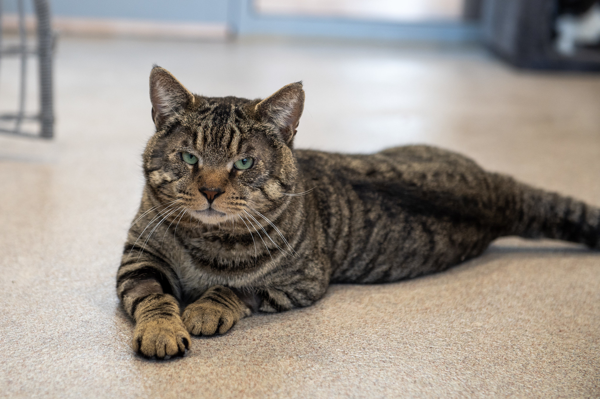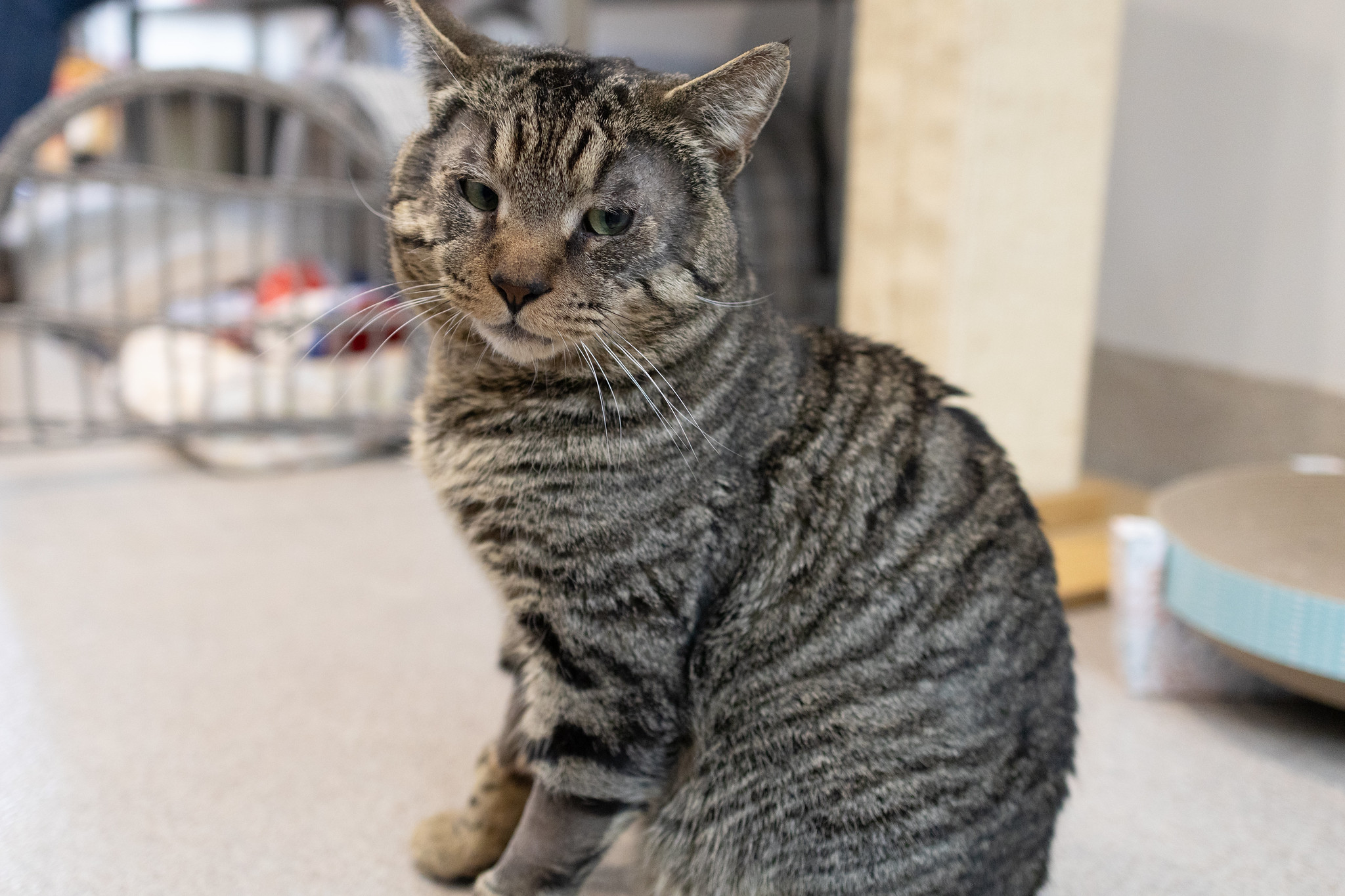 There is something so distinctive about Jamison. You can tell even just by looking at him. His eyes sit on his face in a way that’s somehow more proportionately human than cat and gives him the appearance of a fine, distinguished gentleman who looks as if he’d like to tip his hat to you. Since he has no hat to tip he will do the next best thing when you enter his suite and that is to immediately come greet you with a welcoming meow and flop before you. Jamison is a cat of the people and for the people. This friendly, affectionate tabby wants to meet you, be near you, and to give and get all of the cuddles with you. He is so easygoing that he even loves to be held like a baby, which is such a treat (for both human and kitty alike)! He is a sweet boy who is just waiting for his forever lap, but will patiently take any lap on offer in the meantime. There is room in that big open heart for all of us.