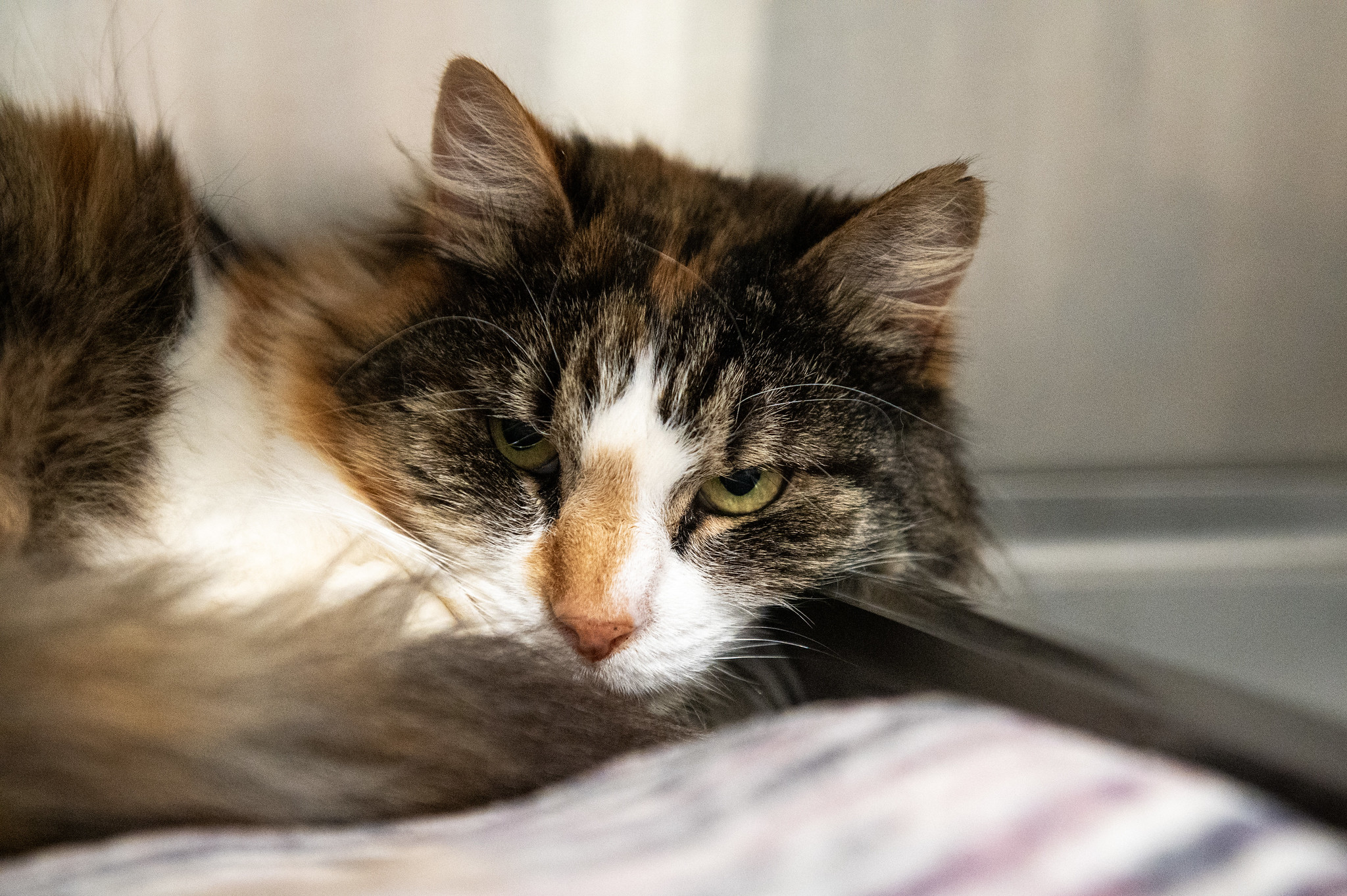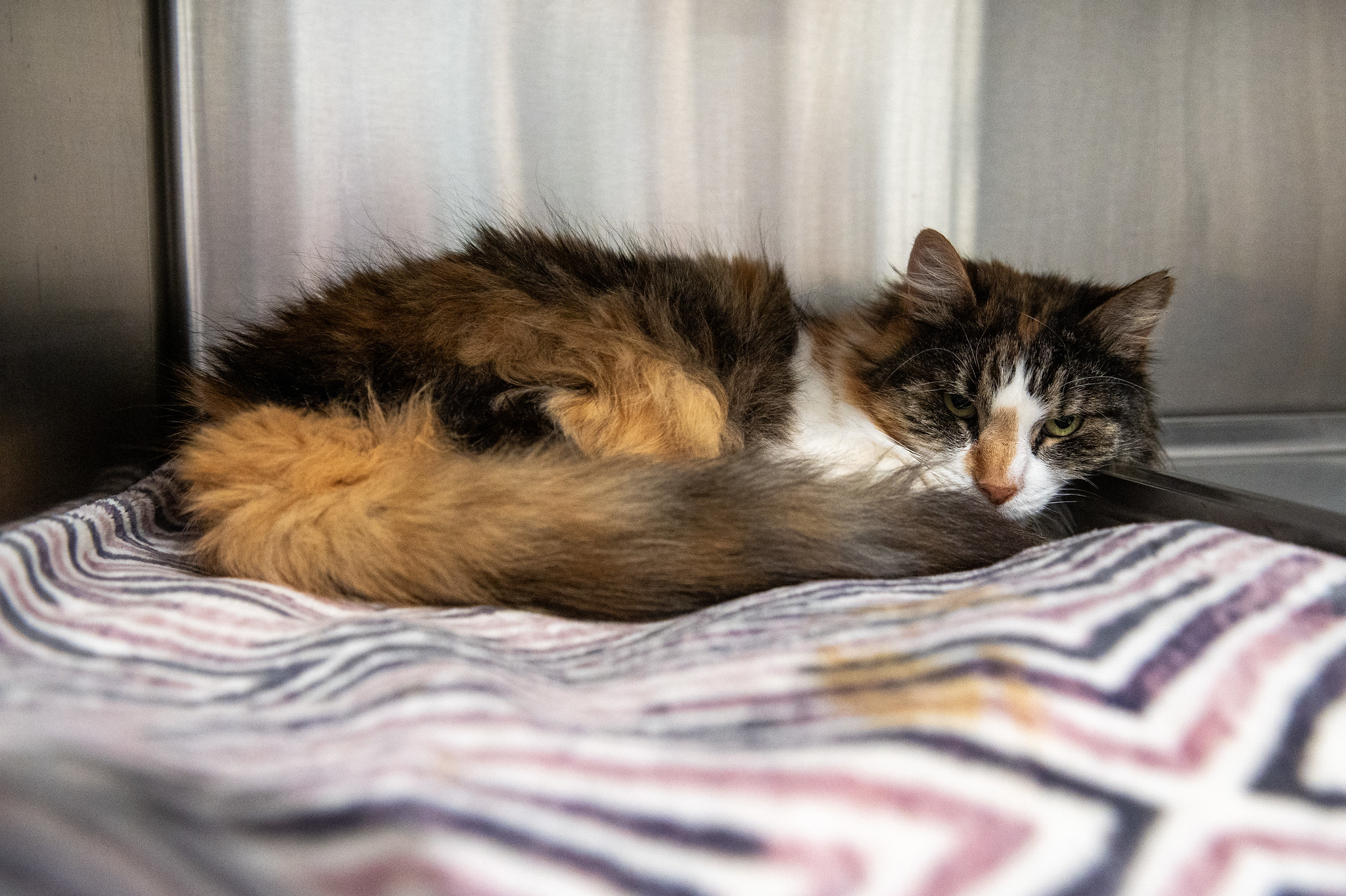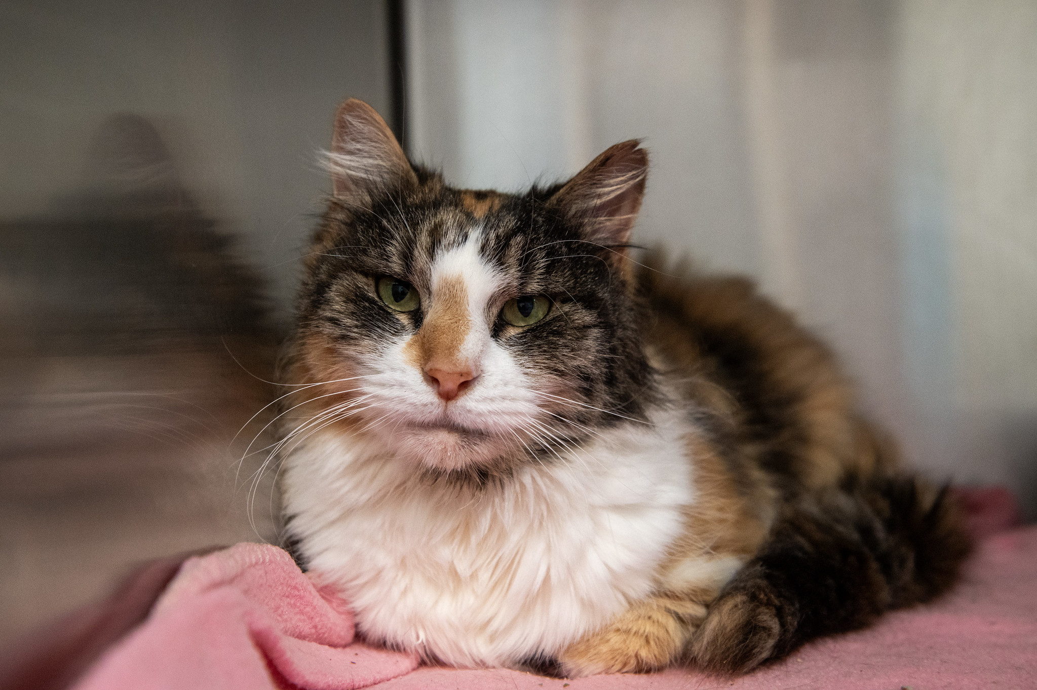 This medium-haired calico cutie arrives with a swirl of soft colors and an unforgettable feature: her gloriously oversized paws. They’re the sort of paws that look like they belong to a gentle forest creature, padding confidently toward you with purpose — the purpose being love, of course. And oh, does Analisa love.