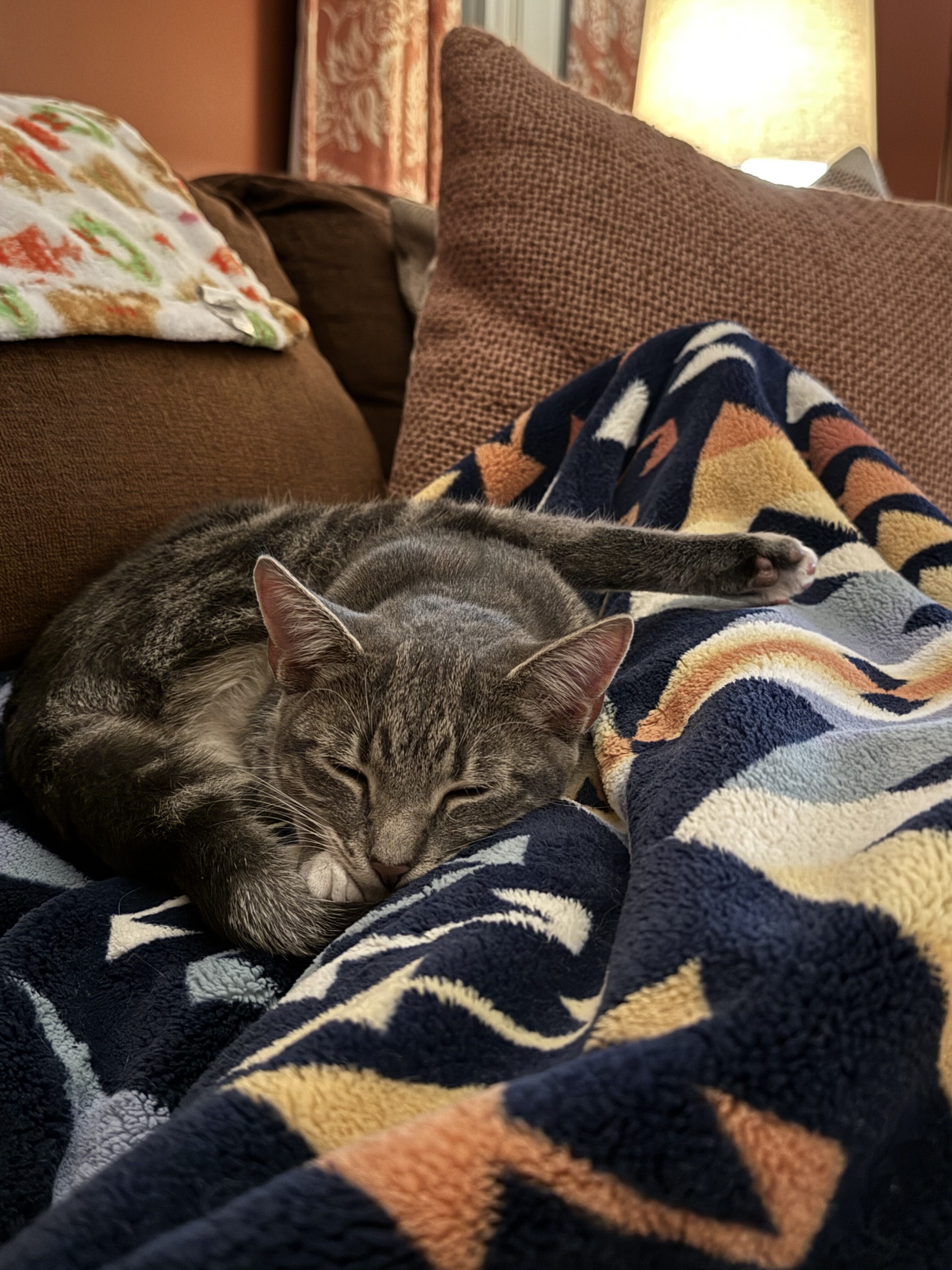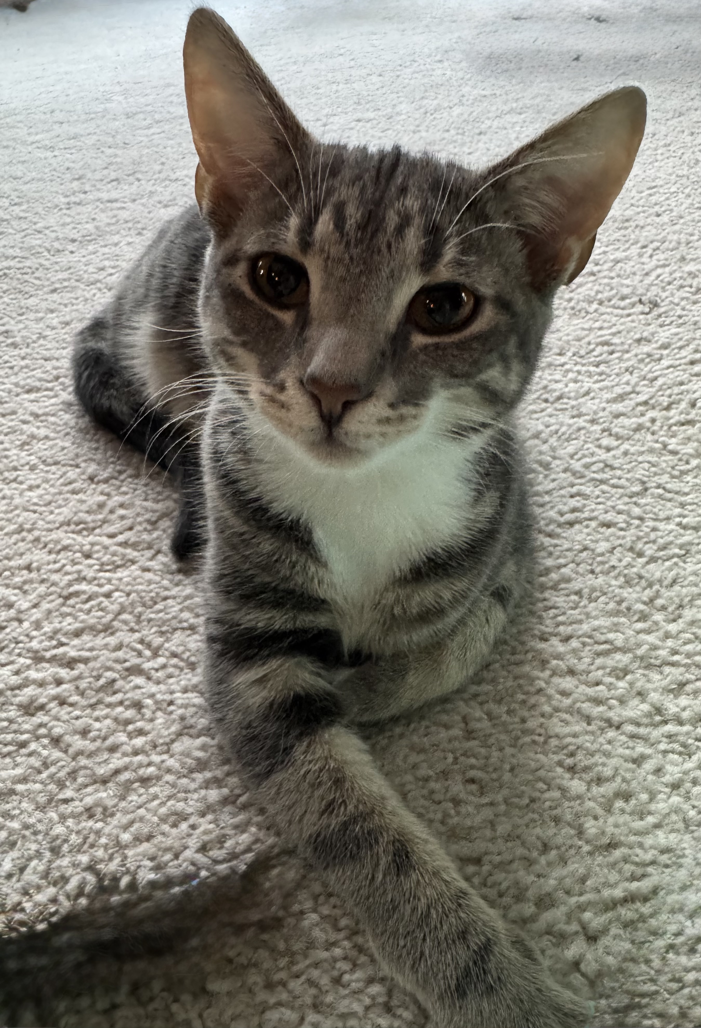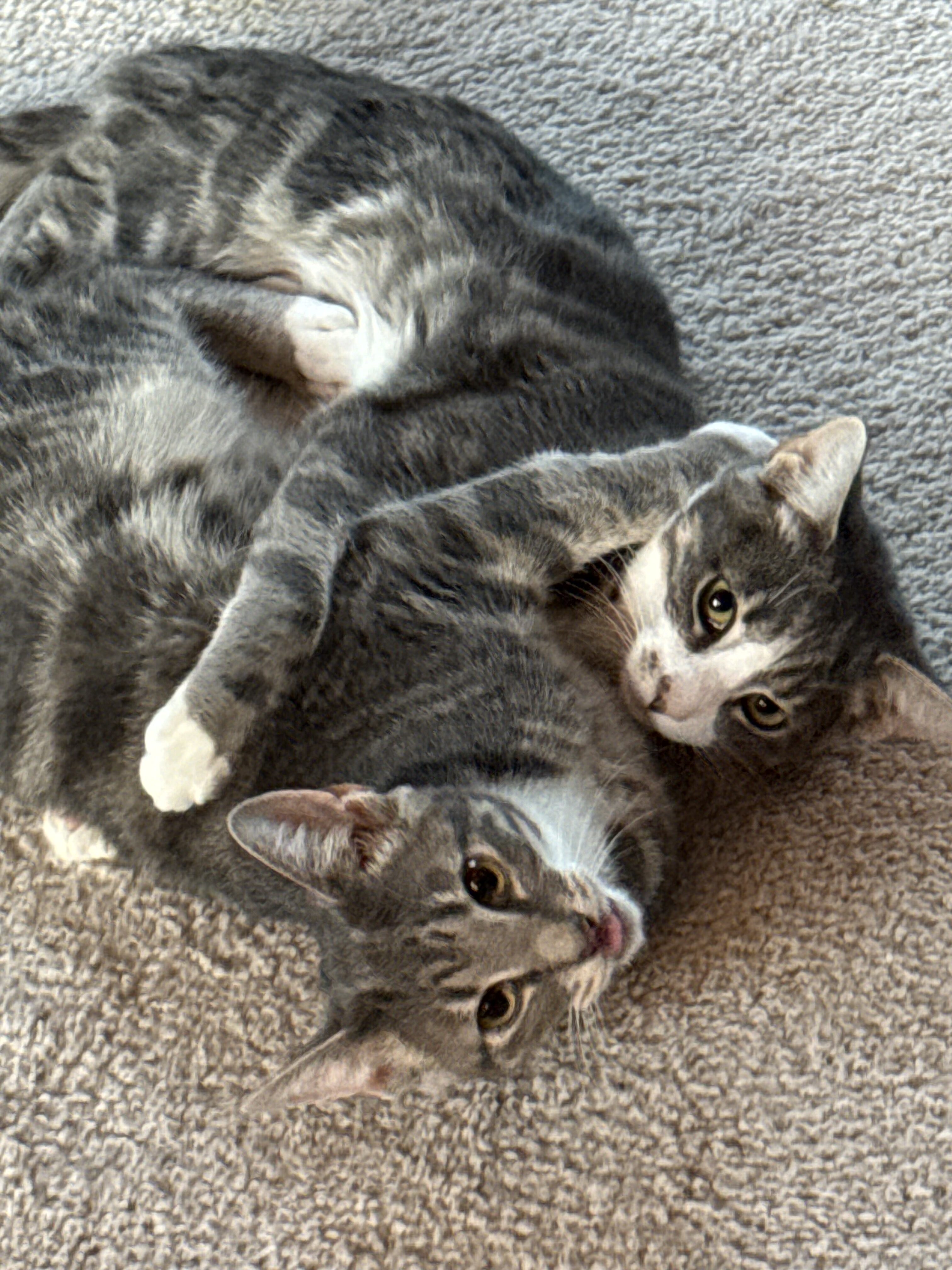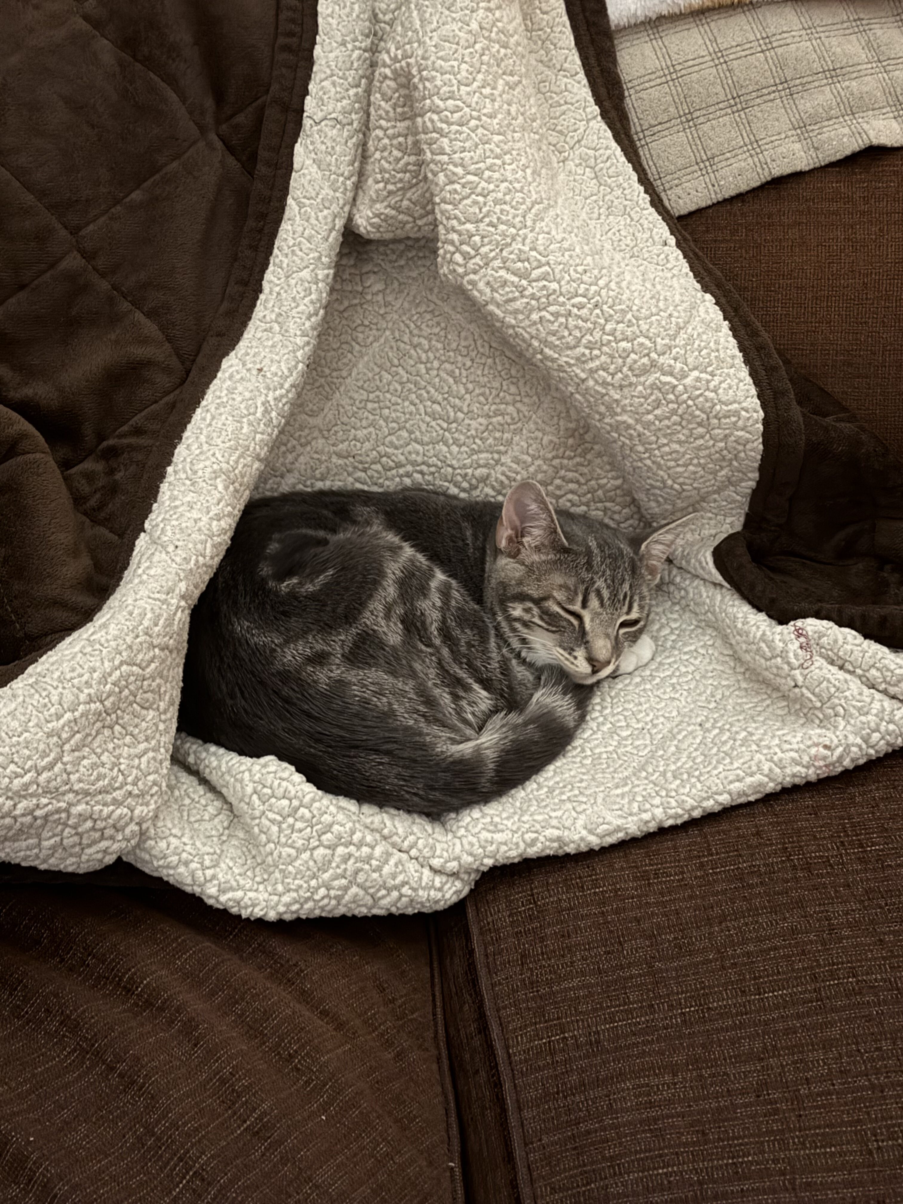 Our little ones have been fully vetted. As you’d expect, they love to play, and they race around like maniacs until they suddenly fall asleep. Nap time lasts just a short while, then play resumes. While adopting more than one kitten isn’t mandatory, it’s awfully nice for these young’uns to have someone their age to play with.