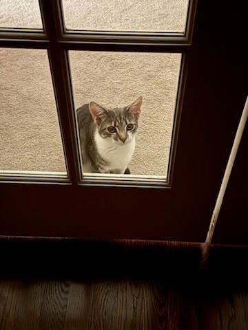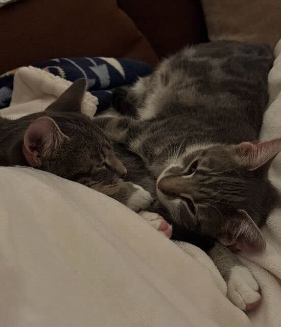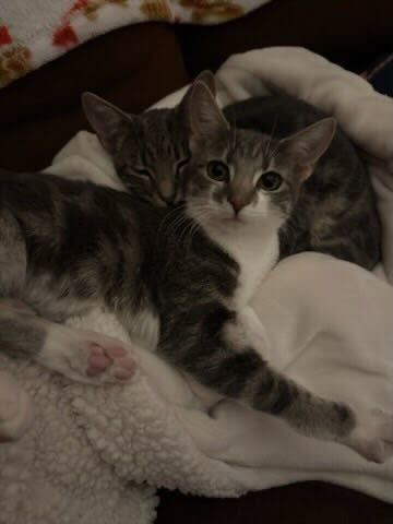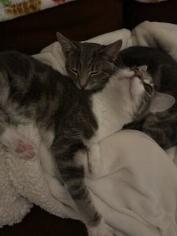 Our little ones have been fully vetted. As you’d expect, they love to play, and they race around like maniacs until they suddenly fall asleep. Nap time lasts just a short while, then play resumes. While adopting more than one kitten isn’t mandatory, it’s awfully nice for these young’uns to have someone their age to play with.
