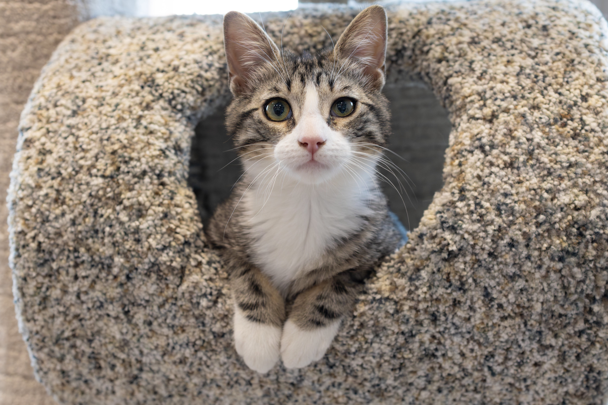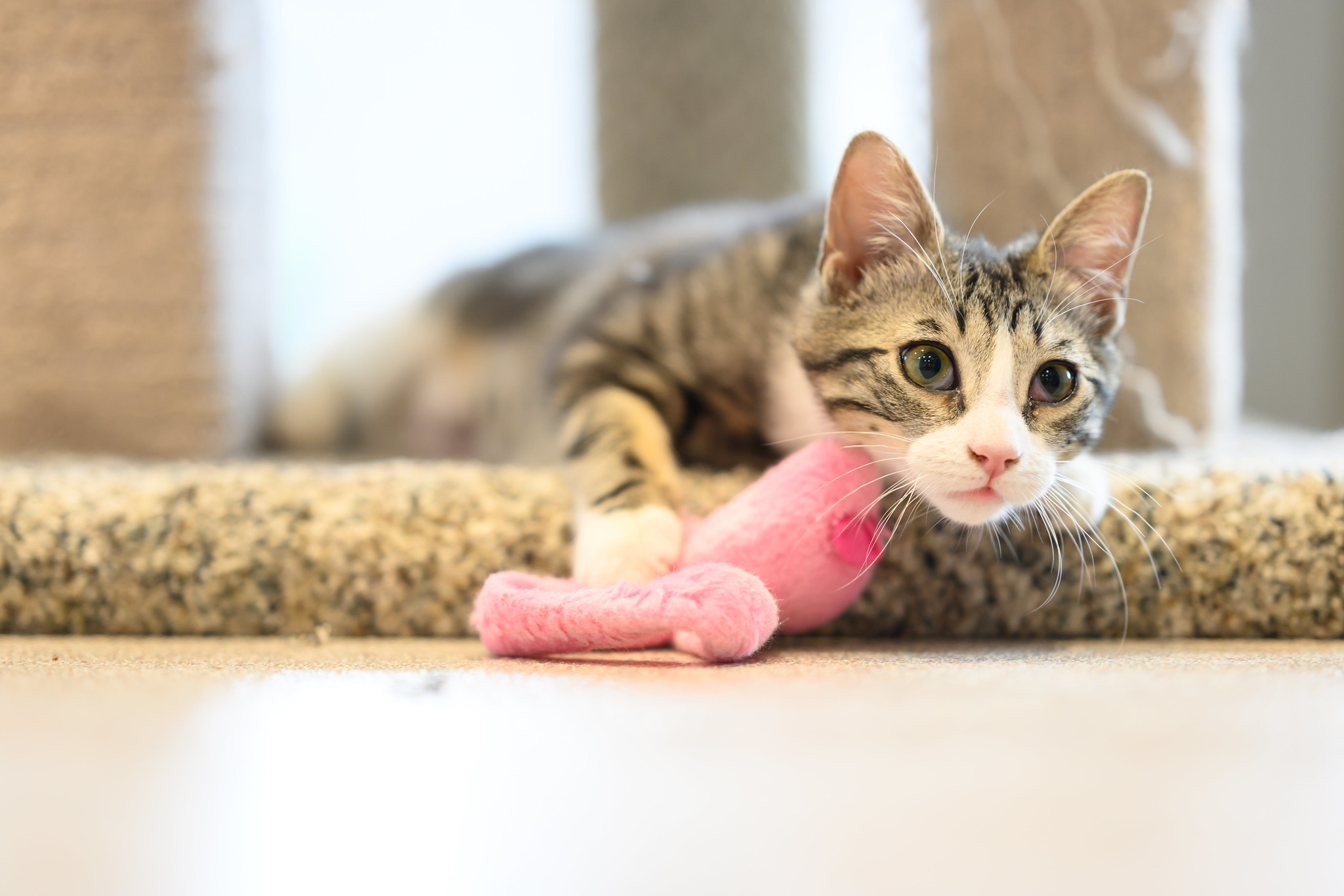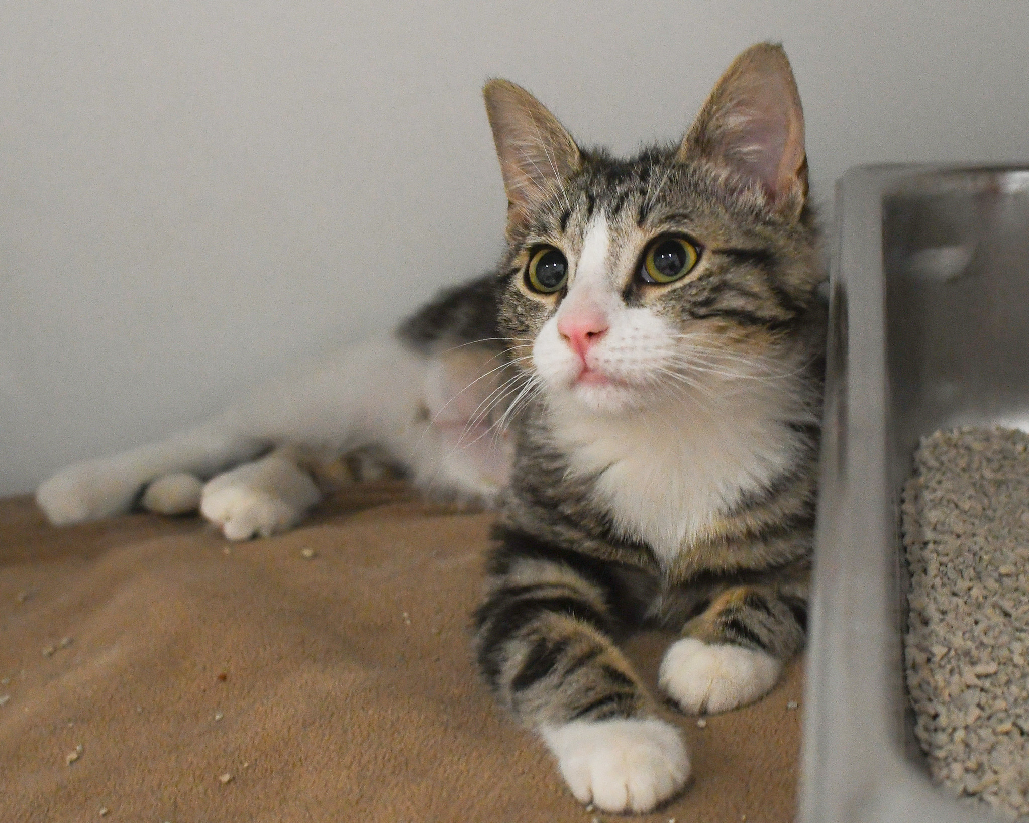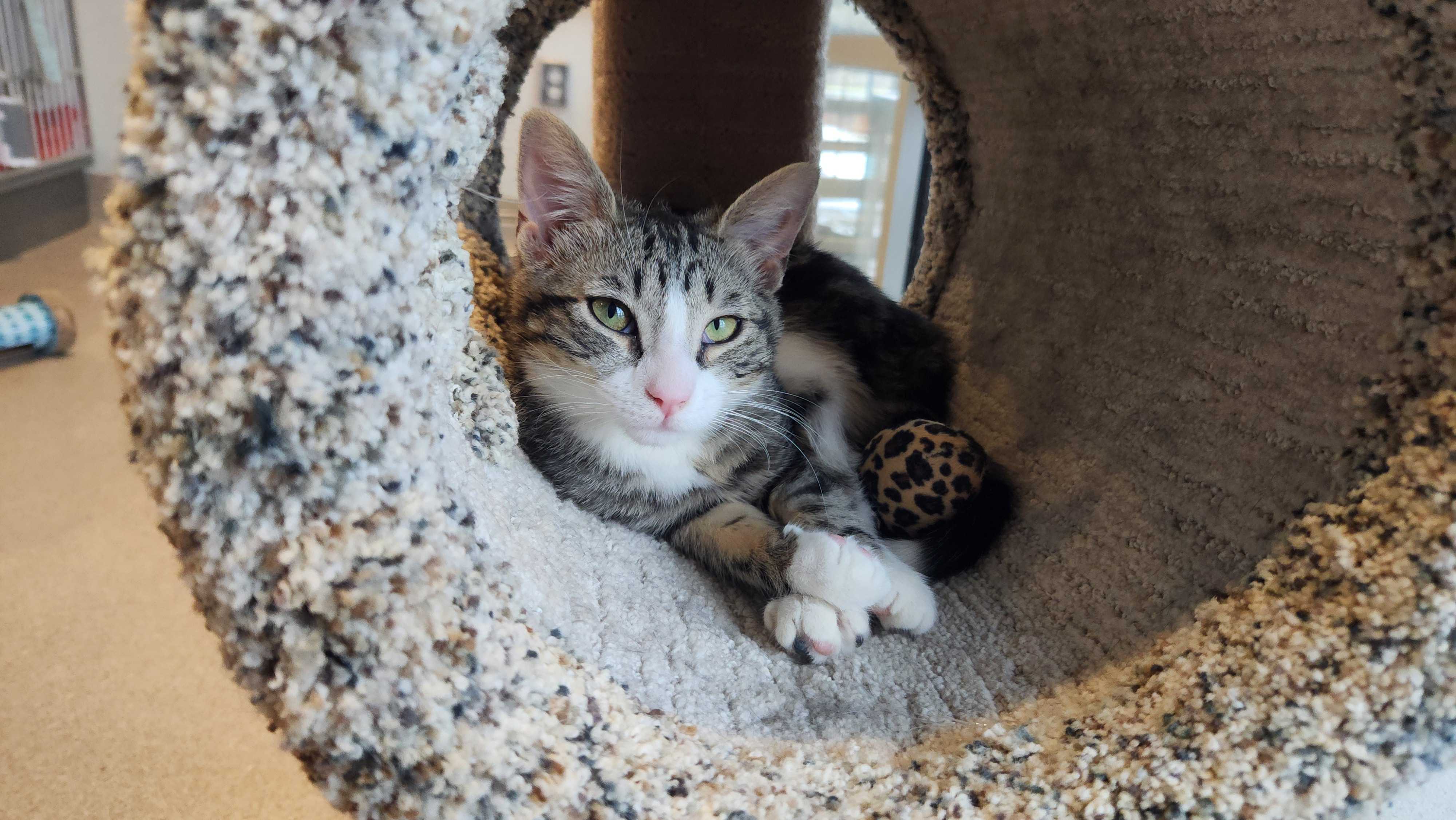 Our little ones have been fully vetted. As you’d expect, they love to play, and they race around like maniacs until they suddenly fall asleep. Nap time lasts just a short while, then play resumes. While adopting more than one kitten isn’t mandatory, it’s awfully nice for these young’uns to have someone their age to play with. Mango would love to be adopted with her brother, Jalapeño!