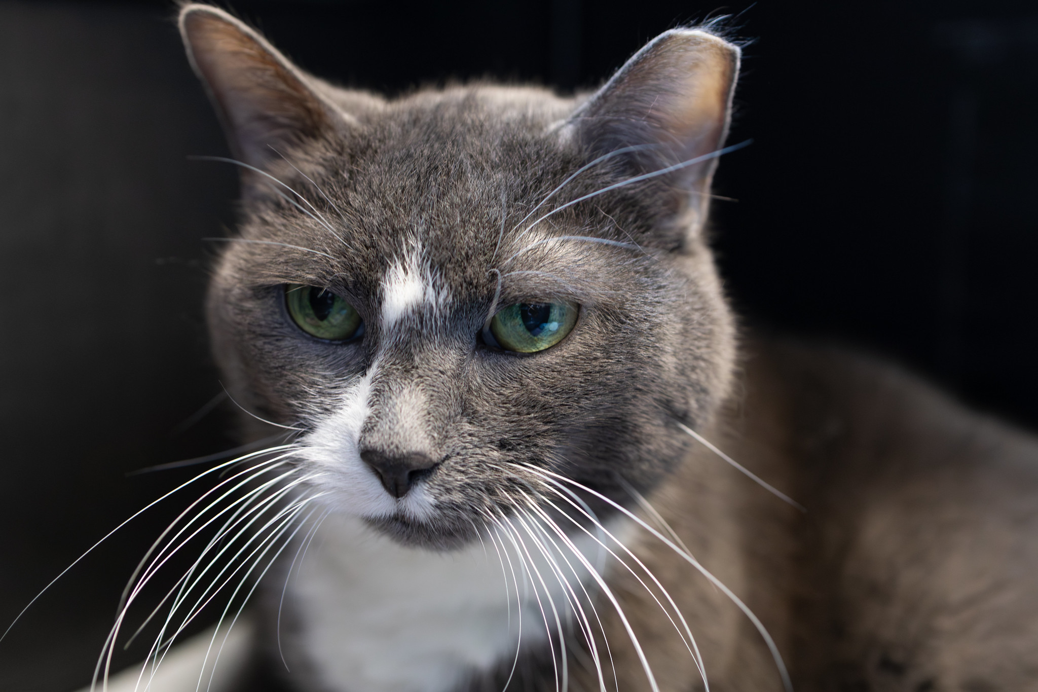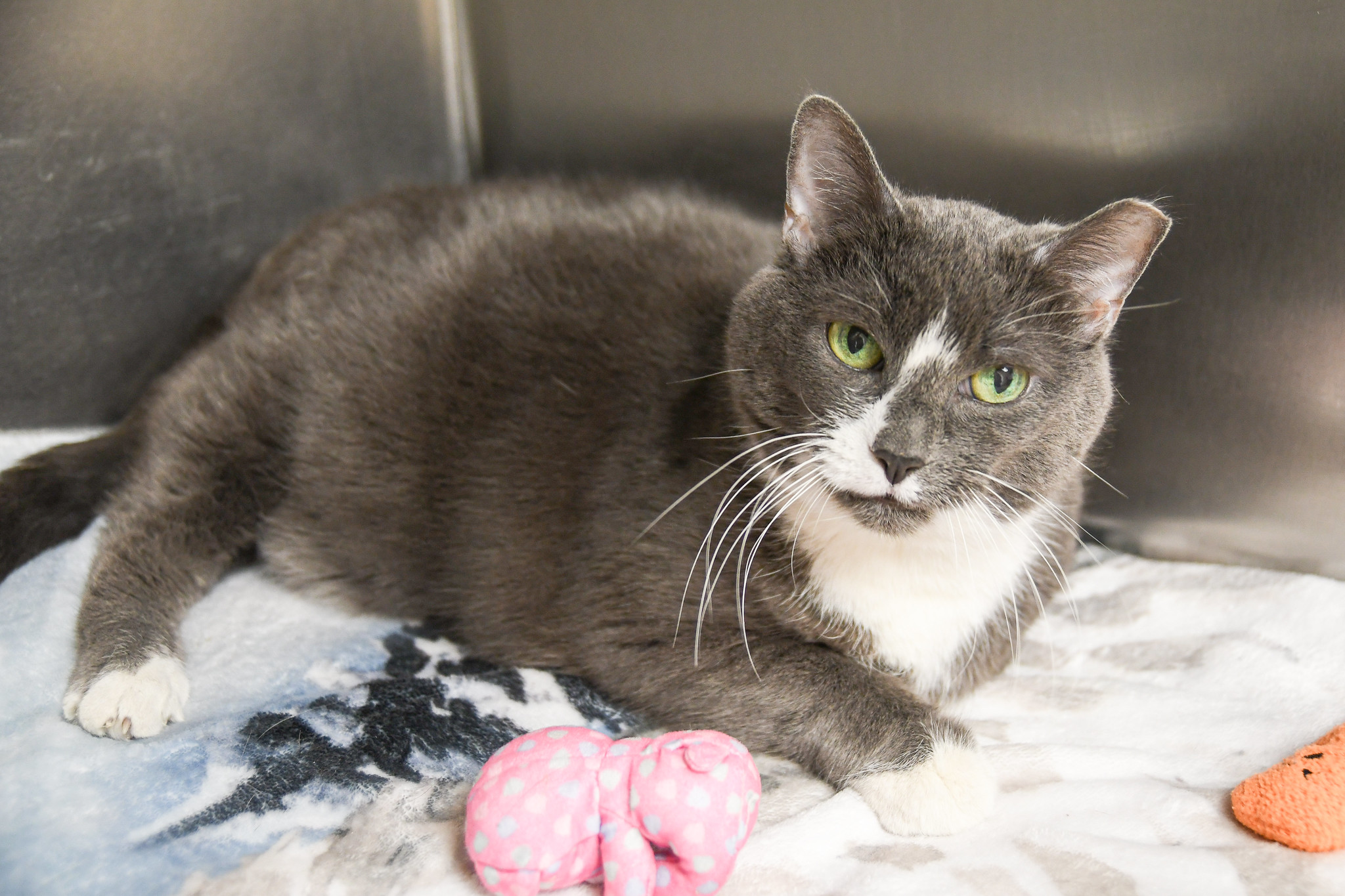 For Kamate, there’s nothing “new” about this friendship. Though she may wait politely to be noticed, the moment you lay eyes on this sweet, gray girl she begins purring like she’s known you forever. There’s no shyness about her, and she’ll let you know when she wants affection with some enthusiastic nudging and headbutts. Once she’s done greeting you and catching up, she’s ready to play and bat around some toys.