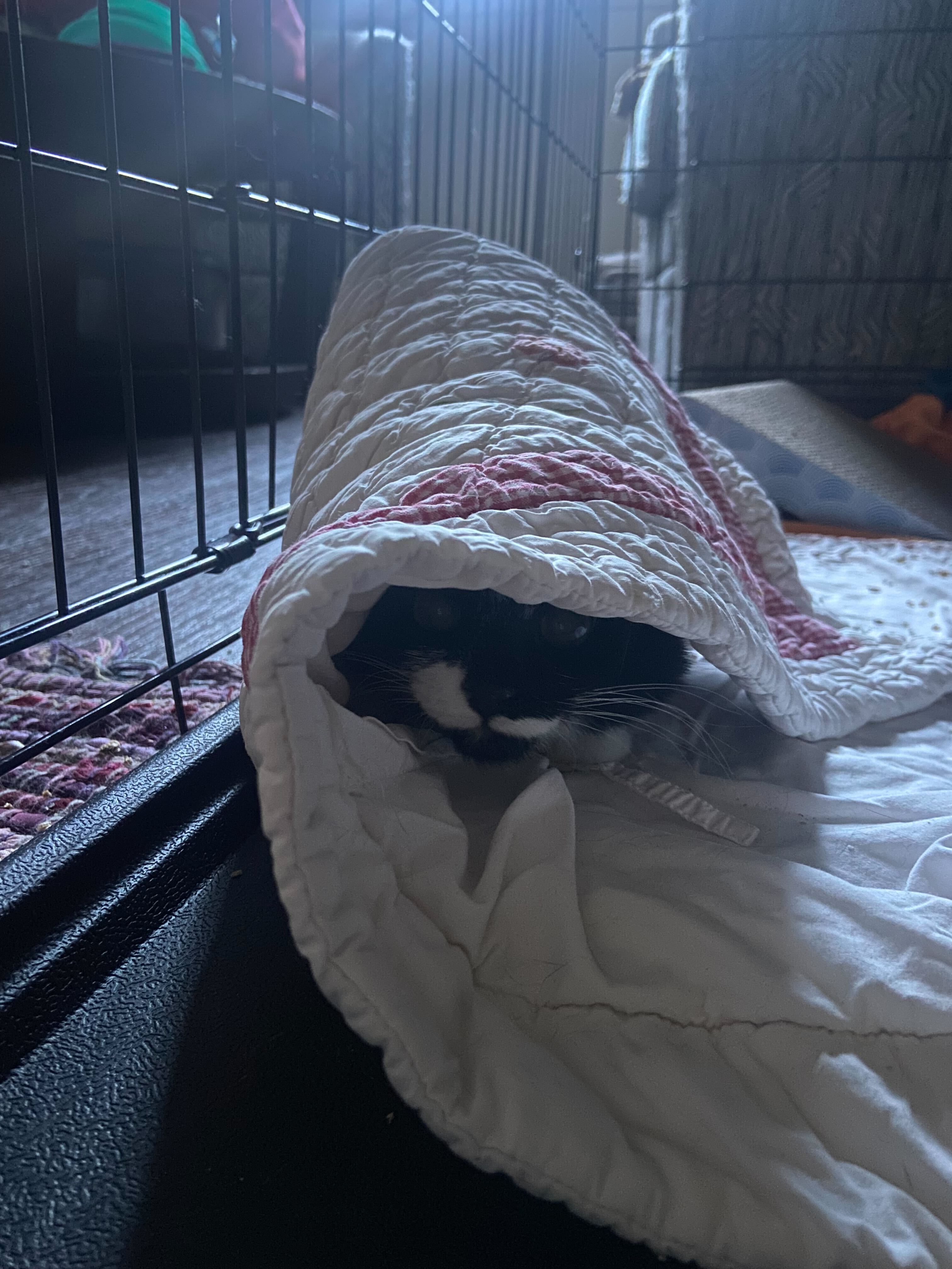 DW was born outside, and did not have much interaction with people before coming to Tabby’s Place. As such, she is still quite shy. Humans are large and scary, so being fearful in their presence at first is completely understandable! That being said, young’uns like DW adapt quickly, and with time and consistent socialization, she has the potential to become an affectionate, loving lap-cat.