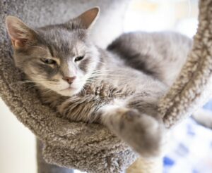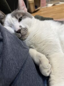 The first story is, albeit brief, doubtlessly one you’ve heard before. It is a tale of a tail that has gone missing from an absolute hippopotamus of a cat. Hips is smaller than he was when he first earned the nickname. That’s because the lobby was turned into a reduced-treat-zone. Yet, Hips’ appetite for attention – to give and receive – is entirely unbounded, as is his energy store (kind of like a looseleaf binder whose leaves are unbound leaving papers strewn every which where). One page of the book of the stories of the ages tells of how Hips was sent to Tabby’s Place by angels IRL. He himself is no angel, but our love for him is absolute.