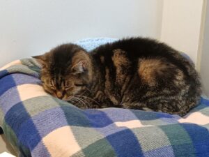 Meanwhile, in a room relatively far away (as things go in one fair-sized building), another story is still in its earliest drafts. The tale is of Roberta, who wishes you wouldn’t notice her. BUT…Roberta spends a lot of time in front of the hallway window in her shy-guys FIV+ suite. Since she is blind, it is unlikely that Roberta is aware that she spends much of her days in full view of visitors, staff, and volunteers. What she certainly does know is that her bed is always cozy, and her belly is always full. What we are discovering is that Roberta is spending less and less energy on hissing at us (We’re still proceeding slowly with our nervous friend.). And, we know how very many possible turns that her story can take, so we’re reading on to see how her tale will unfold. One thing is quite clear: every single version begins and ends with love.
