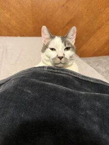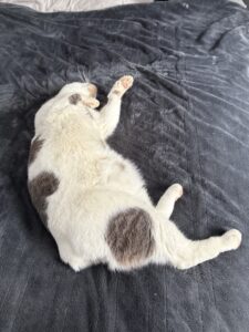 As we visited in the Lobby with staff and kitties, Hips stealthily made his way to the highest of the cat trees. He rolled onto his back, hung his head upside down, gazed into Johnathan’s eyes, and promptly kissed his head.