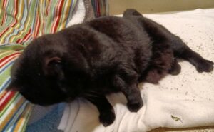 Why is there a breeze where normally fur would maintain warmth and modesty? To put it delicately, Sootie has some challenges. Those challenges occasionally require special clean-ups. When such clean-up needs are on a frequent-enough repetitive cycle, the best thing that can be done is a bit of barbering, which, in such cases, is called a hygiene shave. Thusly, Sootie has been em-bare-rassed because of some tummy troubles. Or, well, maybe her tummy is okay. Technically, her tummy does its job. But, what happens next doesn’t always go so well, or at least not as solidly as it should. Yep, this is, yet again, about poop. Tabby’s Place is, after all, a cat sanctuary, so it always comes back to poop.