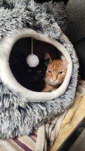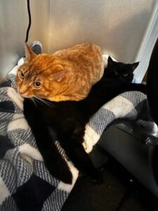 The visitor did not look anything like Sunny and Schwartz. The visitor looked exactly like Sunny and Schwartz. In the kindness of her eyes, a family formed on the spot. One gentle adopter gazed at two grieving cats and saw forever.
