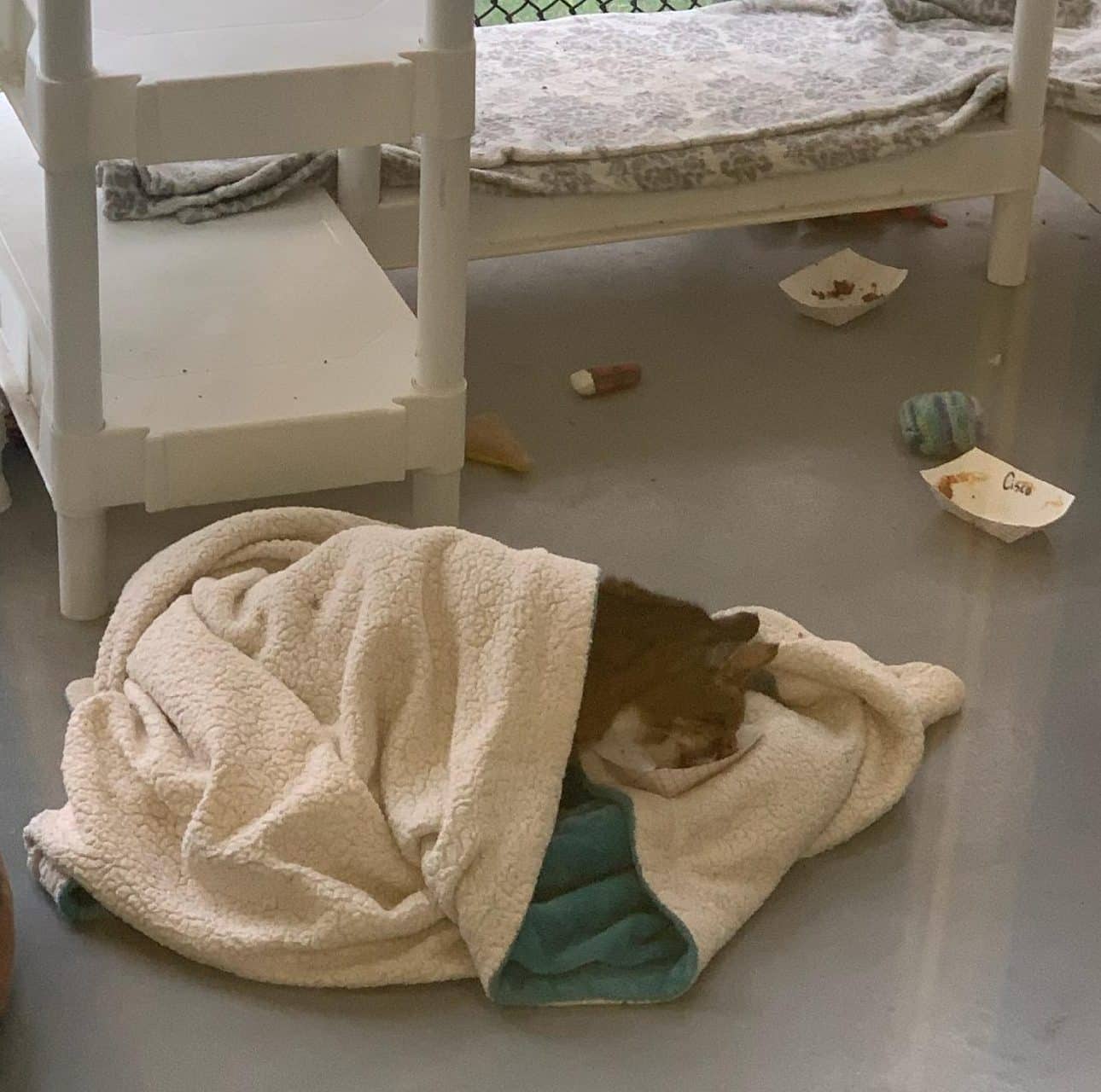 Despite the onset of much colder weather, Cisco insisted on remaining in the fresh air. On numerous occasions, the staff had discussed our concerns about him being too cold outside. However, all attempts to carry him indoors were met with agitation on his part. What made Cisco the happiest in his last months was to enjoy the fresh air from a low perch or an igloo. He knew how to find the warm spots, and everyone else, human and feline, made sure to accommodate him. Just a few weeks ago, a staff member caught him breakfasting in bed (see photo).