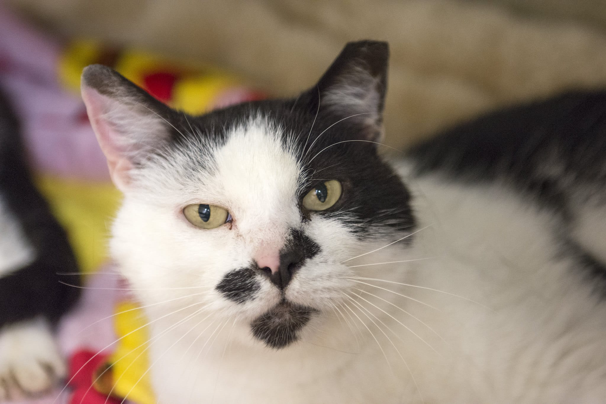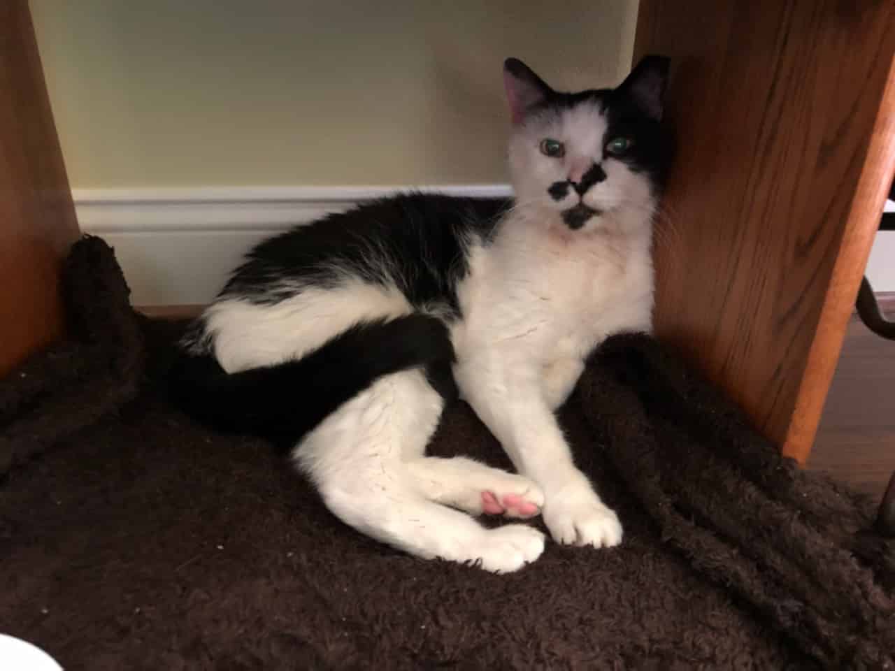 Since Lester has found a home to call his own, your sponsorship has been transferred to another Special Needs cat: charming Fenek. Fenek has diabetes so he receives daily insulin injections and eats a special diet that helps to regulate his glucose levels. Fenek shares an office with our Director of Volunteers and another special needs kitty, Bacon.