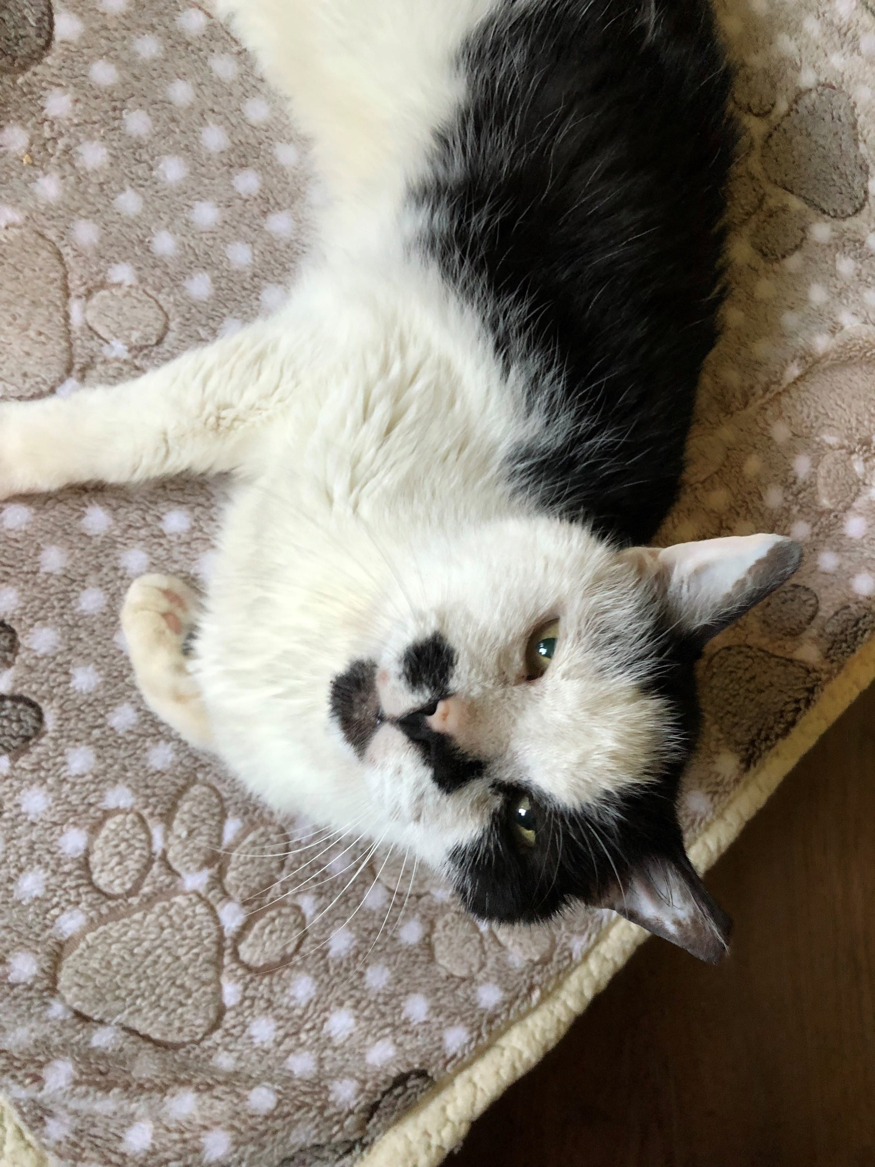 My two favorite things about my new home are (1) all the love and attention I’ll get from my own dedicated people who are home a lot, and (2) it’s a peaceful, quiet home so I can finally get away from the sometimes rowdy and rough-and-tumble FIV+ guys (I know, I used to be one of them!). The only downside is they will be continuing the special diet for my sensitive tummy. I’ll see if I can charm them into changing their minds about that.