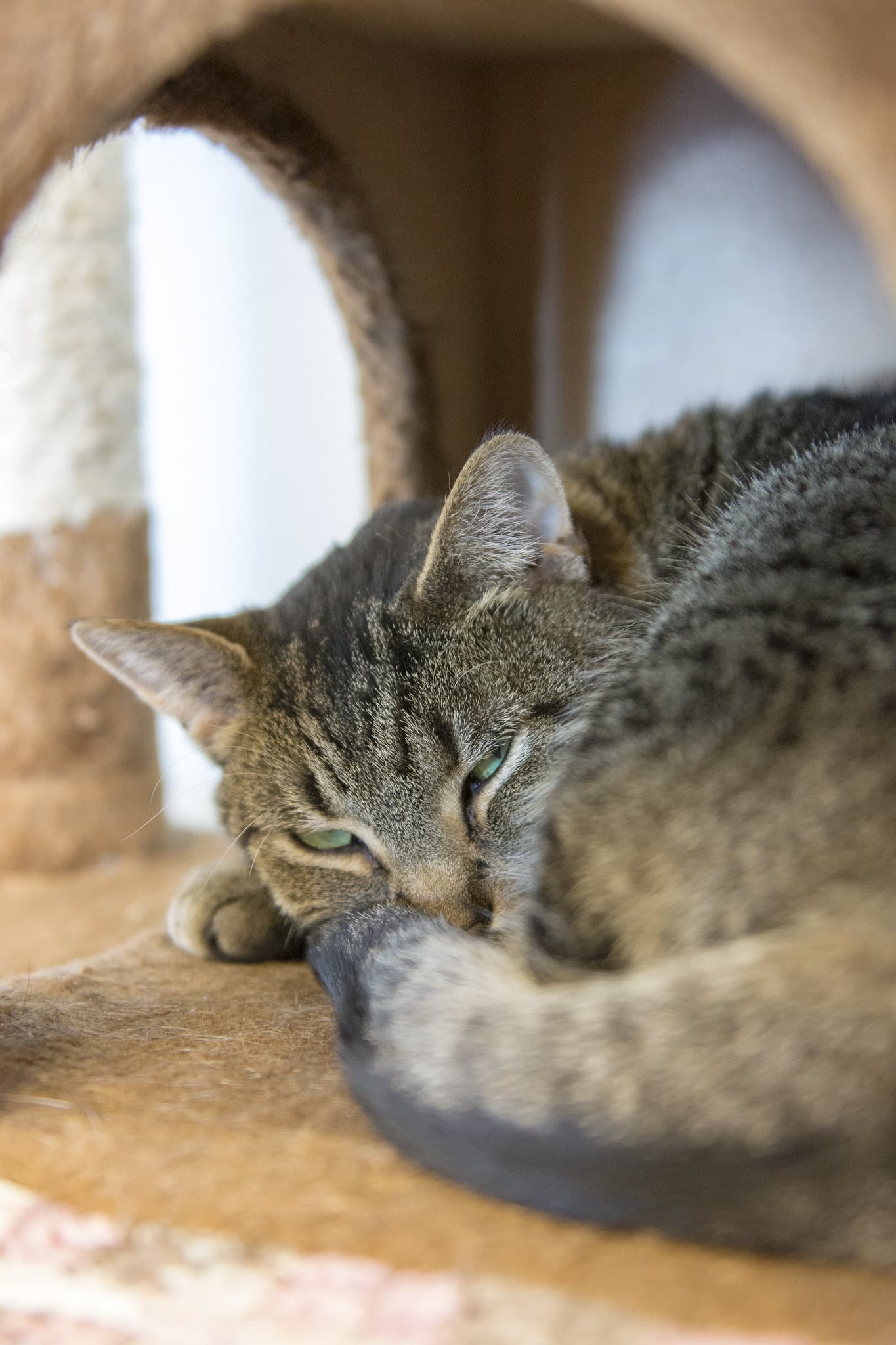 But, I was also sad that I wouldn’t be able to say goodbye to her one last time. Because, you see, I’ve known Sammy for over four years. When I first met her, she was hiding under a large cage in one of the larger suites, and even when I stretched out on the floor, I could barely see her. I was told, “she’s a beautiful brown tabby. But she’s very shy.” Gradually, she would come out from hiding, but whenever I came to visit, she rushed for cover. It took months before she wouldn’t run when she saw me.