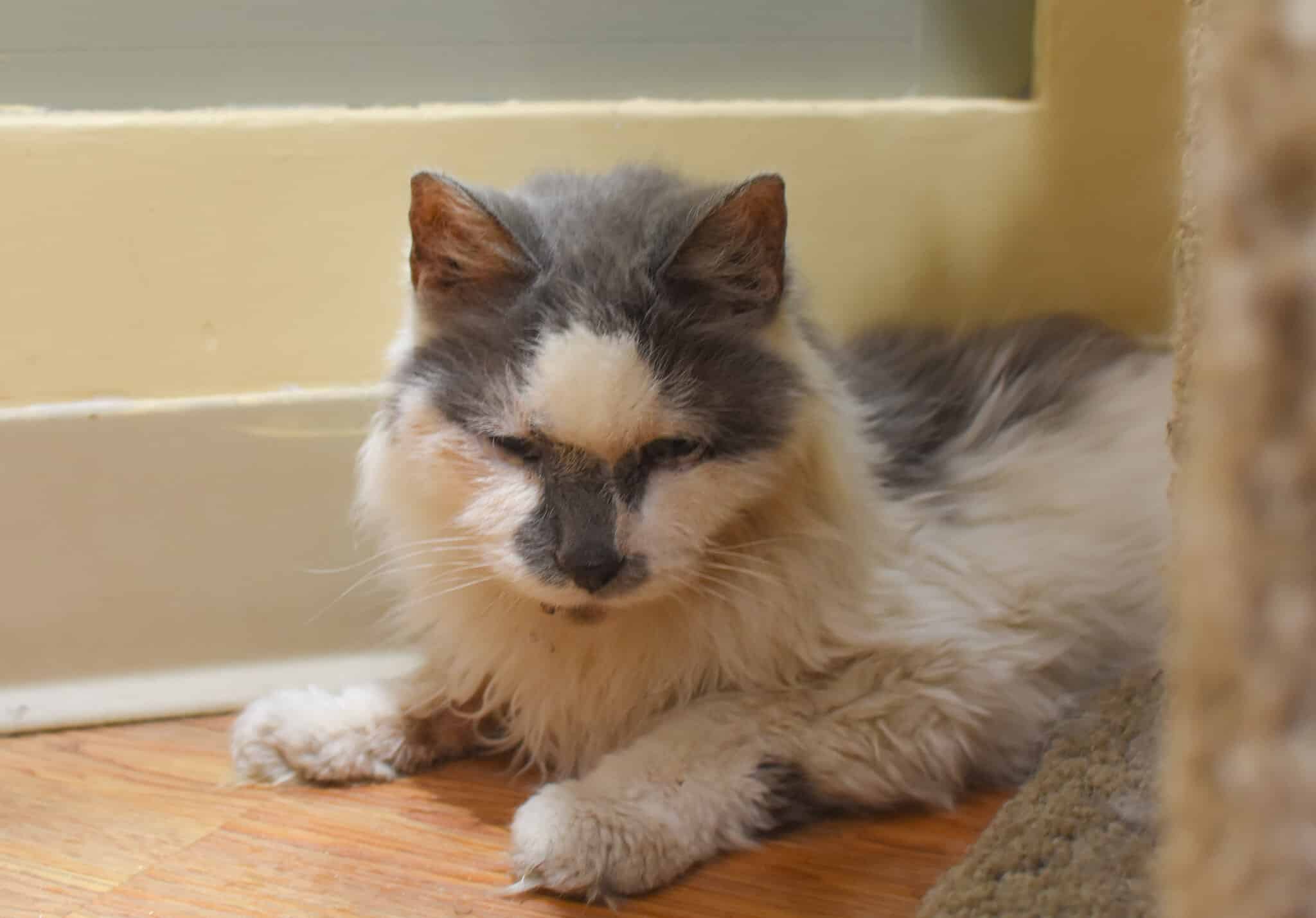 Since Simon has found a home to call his own, your sponsorship has been transferred to another Special Needs cat: Simon’s former housemate, Hobo. While Hobo isn’t diabetic, he has his own host of special medical issues. He is one of our lucky Lobby residents.