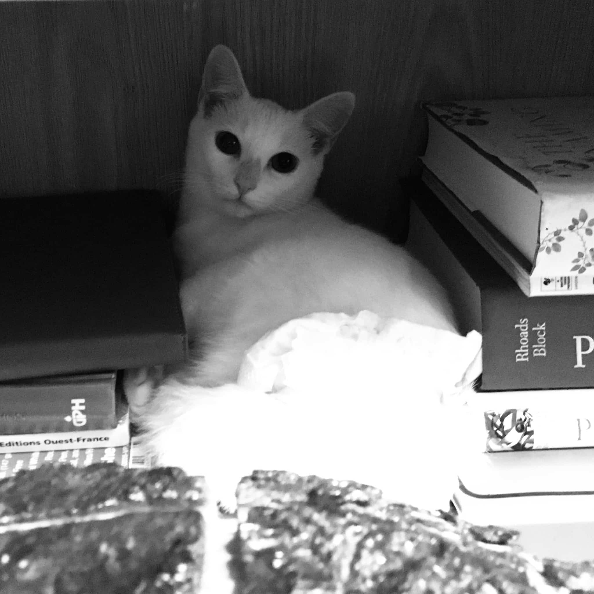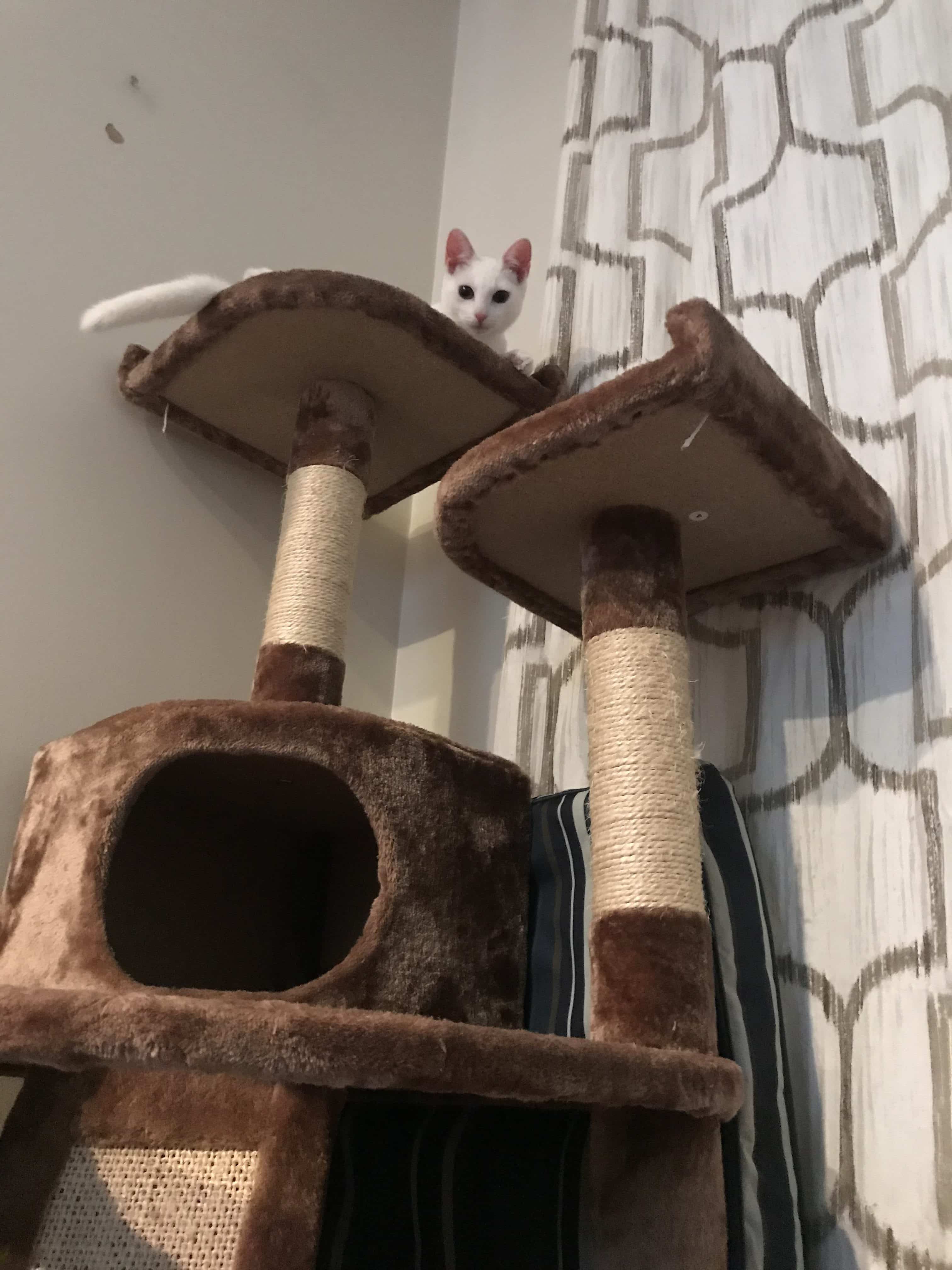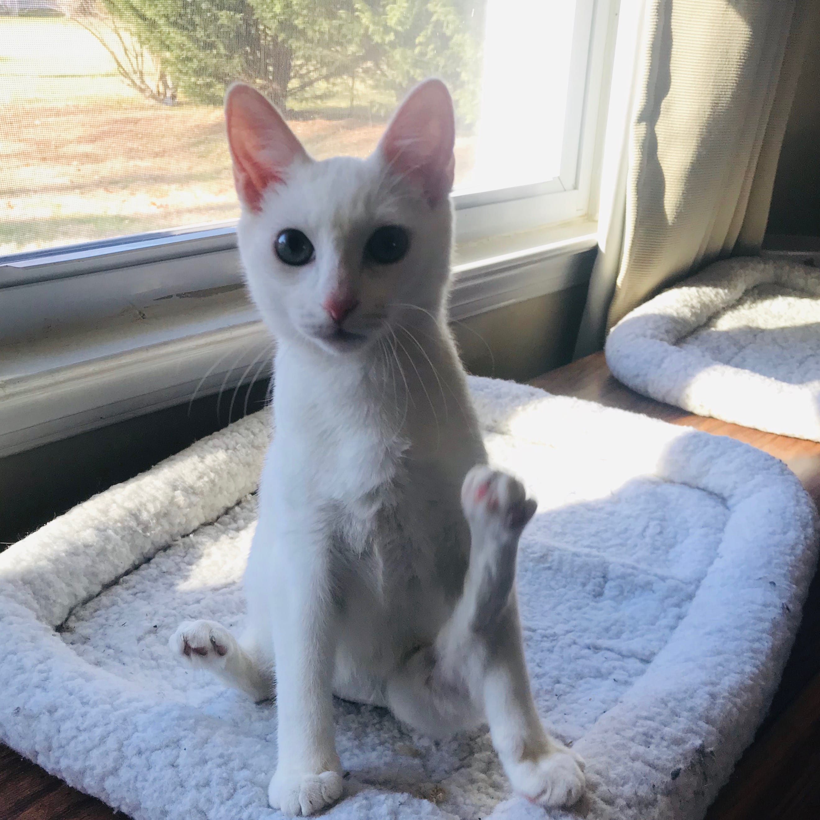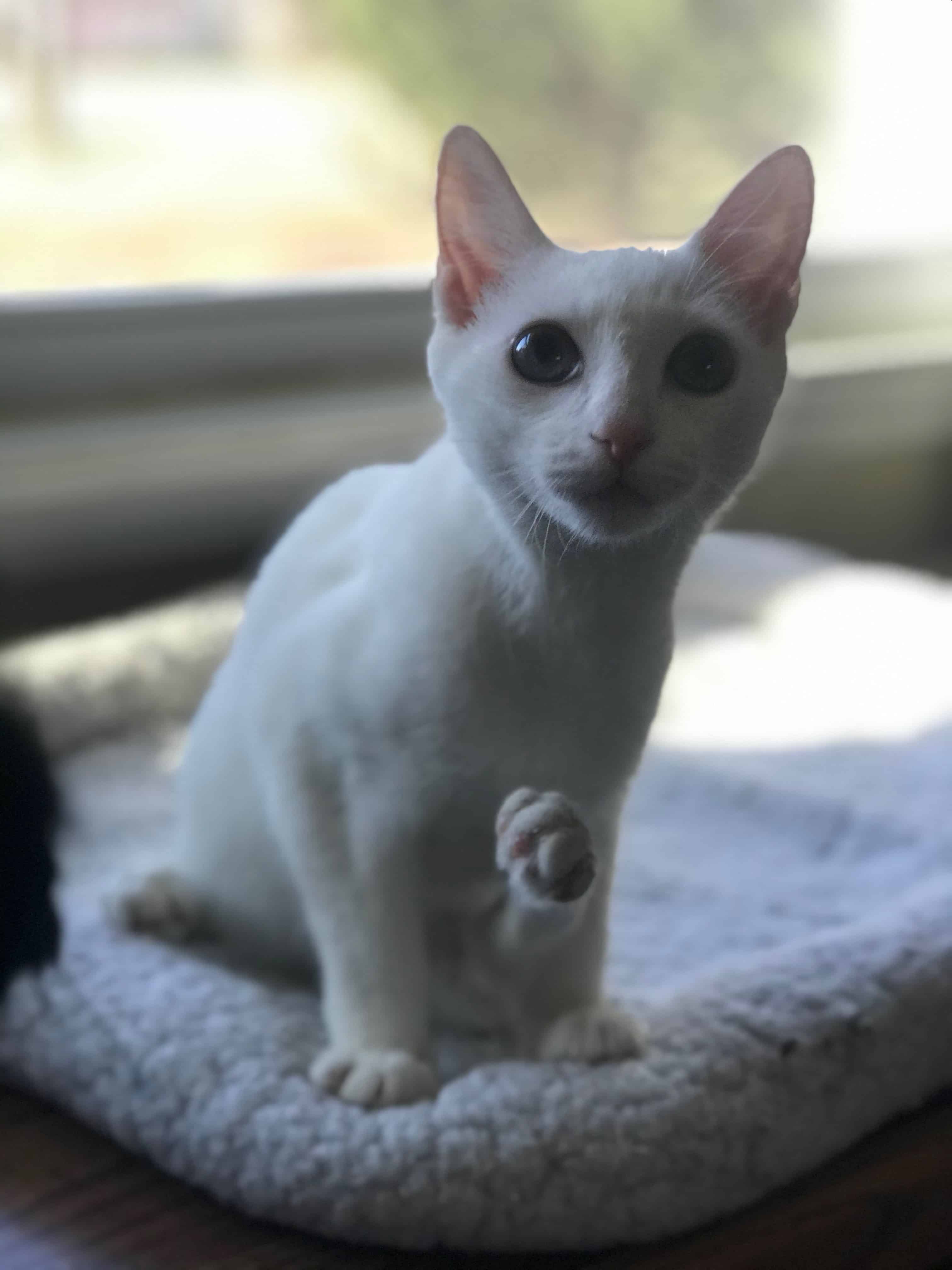 At a mere 4.5 pounds, Tadpole is a tiny thing with big eyes and an even bigger spirit. She may be the littlest in the family, but she doesn’t take any nonsense from anyone–not even her brother, who is more than twice her size! She may only have two functioning legs, but she moves at a rapid pace and surmounts any obstacles in her way. She loves to climb cat trees and human furniture where she can perch and observe the activities below. While this makes her humans very nervous, she is fearless, confident, and persistent. There is no stopping the little white wisp. She even climbs out of her feeding pen when she is done eating.