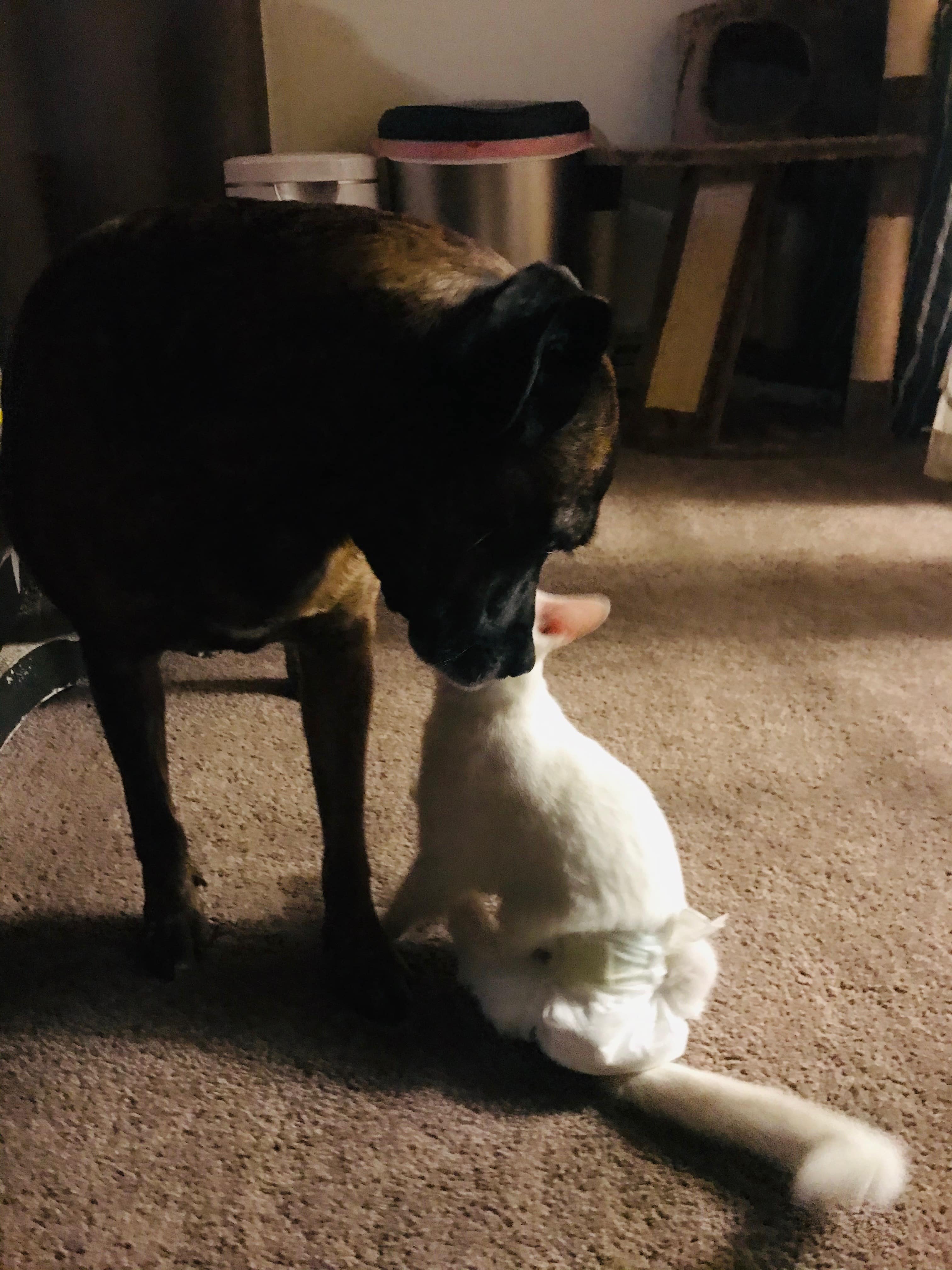 In addition to loving her littermate, Toad, Tadpole adores her human family and her doggie sister, Anna. I’ve seen videos of little Tadpole rubbing herself up against Anna and getting gently nuzzled in return. Taddy doesn’t seek out other cats for snuggles, but she loves human affection. Tadpole likes to lick. Denise reports that when she scoops her up for snuggles, Taddy licks her face with love and purrs.