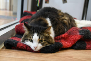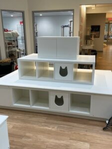 The new lobby furniture that all the cats are raving about - We did some redecorating! Some of our older floors were replaced, and the ancient lobby furniture was replaced with furniture that is both fun and functional. It is no small task to coordinate lots of cats, staff, and volunteers, and the Tabby’s Place team did a great job managing the chaos and keeping track of where each of the cats was temporarily housed. The lobby cats are excited by the new setup. A few of the lobby cats still gather by the doors to Quinn’s Corner, and it’s all they seem to talk about these days.
