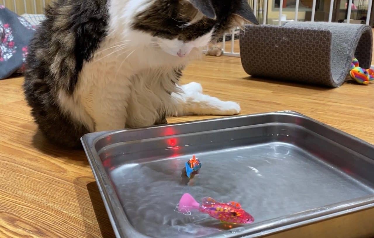 We are always looking for new ways to provide enrichment for Anka. His killer instincts often prove too much for the various electronic or robotic toys that we present. Several days ago he was offered a shallow water bowl with a robotic fish. In seconds flat, he fished it from the water, gave it a few hard shakes in his mouth, and discarded it for dead. The last electronic toy that he “killed” has a small furry fox tail that shoots out of and retreats into a crevice. He grabbed the tail, flipped the whole device over, and dragged it away. These episodes are brief and precise and remind us of what he wishes he could do to the other lobby cats.