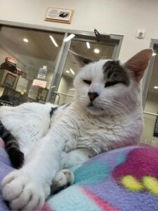 There’s a new guy, Clifford, in the Quinn’s Corner lobby. Because he’s not a fan of other cats (I can relate), he now lives solo in the lobby full time. He seems to enjoy this and has apparently crowned himself King of Quinn’s Corner Lobby. He lounges like royalty, trying out all the soft beds, and enjoys it when humans fuss over him.