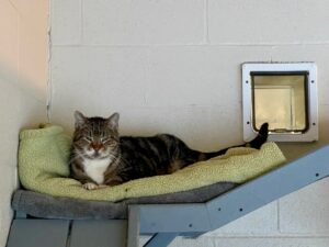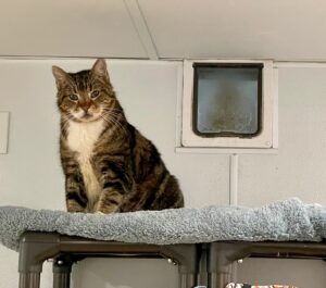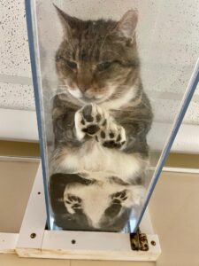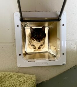 How do the cats get into the solarium, you ask? I think this is one of the most innovative features of the Tabby’s Place building! They go through a ceiling-high cat door and walk across the hallway through a Plexiglas tunnel! Each of the suites has a cat door that gives cats access to the outside.