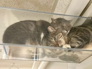 Their dedication and kindness allowed the rest of the staff and volunteers to stay safely at home during the storm. Cats like Anka, Clifford, Peabody, and Lornadoone were thrilled to have oversized, cushy beds and blankets set up in their areas and even someone warm to sleep with. I’m pleased to tell you that all Tabby’s Place kitties made it through the storm safe and sound.