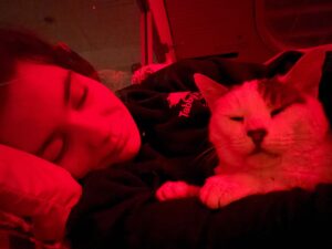 During our recent large snowstorm, some of our devoted staff actually slept at Tabby’s Place to ensure that our kitties would have appropriate feeding and care; look for the photo of Clifford cuddling with one of them.