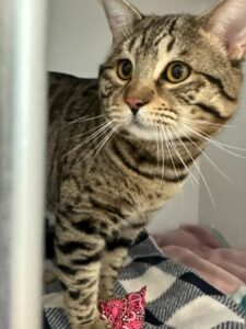 And new to that suite is KB, a large, young Bengal mix with beautiful markings. The staff describes KB as a big mush and very inquisitive. When I met him, he had just been placed in a cage in his suite (we crate all new cats for a few days, so everybody has a chance to get used to one another). Being suddenly exposed to new felines in a new environment would be enough to throw any feline off-balance, yet I saw Braveheart go right up to KB’s cage to sniff him, and KB didn’t react at all—no hissing, no angry meow. That’s a very good sign indeed.