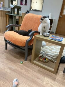 The Friday before, when Mary Anne was visiting me, I wanted to prepare my girlfriend, Prescott, to be on duty with me for the Grand Opening. But she was sleeping away the day. I just jumped back onto my cat tree, took a bath, and went back to sleep, to be sure I was well-rested for all the festivities.