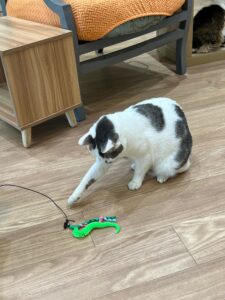 In addition to all my supervisory duties, I managed to get in some really cool playtime. I am especially good with the wand toy and love the worm at the end of it, and get very excited when visitors come and spend time with me. Of course, a nap is always in order after a super duper play session.