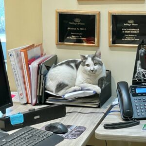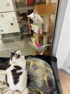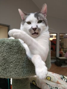 So, we have had several holidays this past month and also a lot of rain. But I am safe, warm, and dry here at the sanctuary. However, some of my antics have not been so nice. There is a kitty named Marcia who lives in the Executive Director’s office, which faces the lobby but is behind a gate. Several volunteers found the two of us having a “standoff” as we both glared at each other. At one point, my ears went flat and I reared up on my hind legs and screamed. Then Marcia and I both smacked each other. Several volunteers had to intervene, but I just kept glaring at Marcia. I even got Harriet upset. Grace, one of the staff, came over and put me in my crate for a time-out. Maybe I need to play Taylor Swift”s song, “You Need to Calm Down.” It seems I have issues with some of the lady kitties–Grecca, Olive, my dear Prescott, and now Marcia. Maybe I need some sort of “supplement” like zylkene or trasadone to keep me steady. The staff here will figure it out.