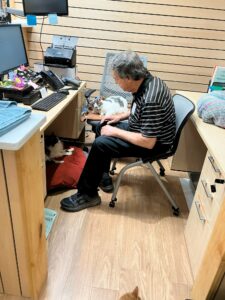 And, my friend Russ visits me a lot.  He has been a volunteer here at Tabby’s for many years.  He has a great beard and I LOVE to nestle in it and climb up on him and wrap myself around his neck.  Russ visits me and sits with me for a long time after he finishes his volunteer duties.