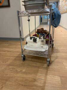 However, that does not stop me from keeping an eye on the volunteers as they clean our area and feed us. I have been hopping on one of the carts to get a clear view of everything. And besides, I love a good ride around the lobby every now and then.