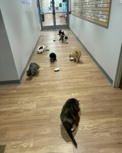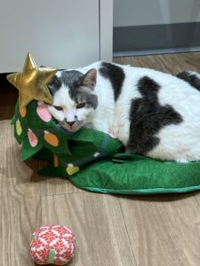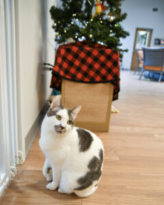 So, it was a very busy holiday season. In keeping with tradition, we 7 cats found a great place in the hallway to have our Feast of the Seven Fishes Christmas Eve supper, thanks to the wonderful staff and volunteers. We gobbled up our wet food and then all went to our separate corners to await the arrival of Santa Paws. And he did not disappoint as we got new toys and good food from all of you dear sponsors.