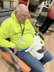 If you were worried that we don’t have any rest breaks or downtime, never fear. I just love to spend time in the lap of one of my favorite volunteers, Kevin. I get lots of pets and hugs and can stay here for a long time. He comes to see me a lot and I know that I am in for some special cuddle time when I see him come through the door.