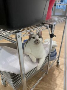 Now that all of the holidays are over for a while, I have been spending time on the computer making sure all the staff are keeping up with the kitties and all of their needs here. And I have been joined in this part of my work (I pawgraphed a contract with the sanctuary to do some chores for my keep, and computer work is one of those chores—LOL!) by my dear lady friend, Prescott. We share space here at the reception desk and switch positions from time to time. But it is very important for us to be on call whenever we are needed. We take our jobs here very seriously.