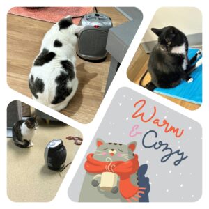 So, it has been a cold, snowy, and icy winter so far. But I am so grateful to all of you, dear sponsors, for keeping me safe and warm here at Tabby’s Place with my lady friends here in the Lobby. You can see that we are taking advantage of the space heaters and warming pads that the staff provides. They are super careful and ensure the heaters are set up properly for us so they are not a danger.