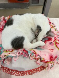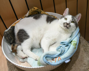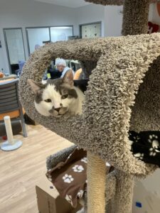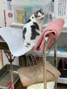 I have been in particularly good health this month. And, as usual, I have been up to my mischievous antics. I love to sneak into the back hallway when the staff and volunteers aren’t looking. You all know that if you close a door, a cat will always try to open it. I just wait for someone to come through who is pushing a cart or carrying a lot of blankets and beds. Then I do my run-through, and I love to sit in the middle of the hallway and look at everything. One day, the staff found me (like magic!) sitting in the hallway outside of the quarantine rooms.