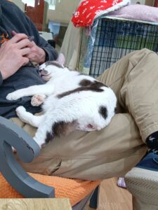 I am just relaxing each day and still supervising the volunteers and staff. And I always look for volunteer Kevin, so I can sit in his lap and get lots of pets. But pretty much any available lap is fair game!