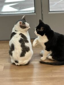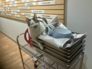 I am enjoying the sunny days as summer comes our way. I love when visitors come to Tabby’s Place and I get extra attention. The Lobby is a center for all kinds of action, from engaging with the volunteers who are cleaning, to seeing the supplies hauled through to the storage area, to greeting visitors, to seeing the kittens roll in (it is kitten season, after all)–I get to be part of it all!