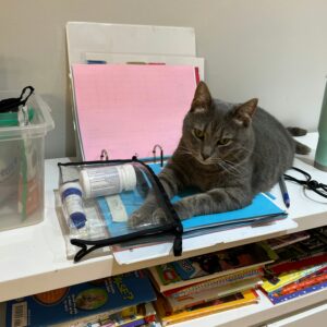 Meanwhile, Lobby duties keep us all busy. Miss Prescott has been helping. She makes sure that all the kitties get their medications by working with the staff to keep track in the meds folder.